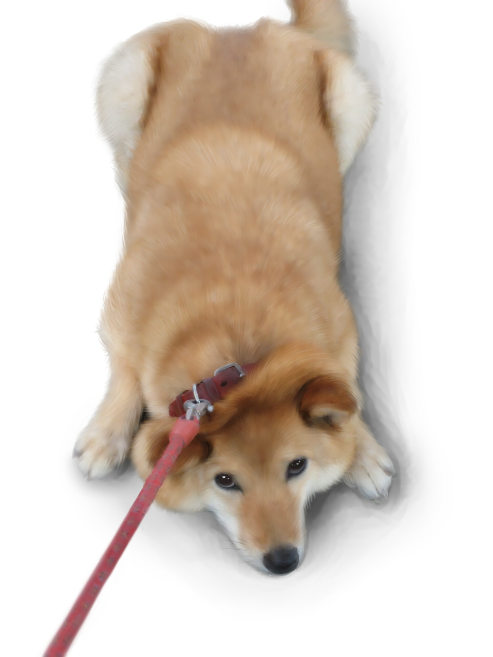 animal focusbody furcollardogleashleash pulllyingno humanson stomachphotorealisticrealisticshiba inusimple backgroundsittingsoloviewer holding leashwhite background