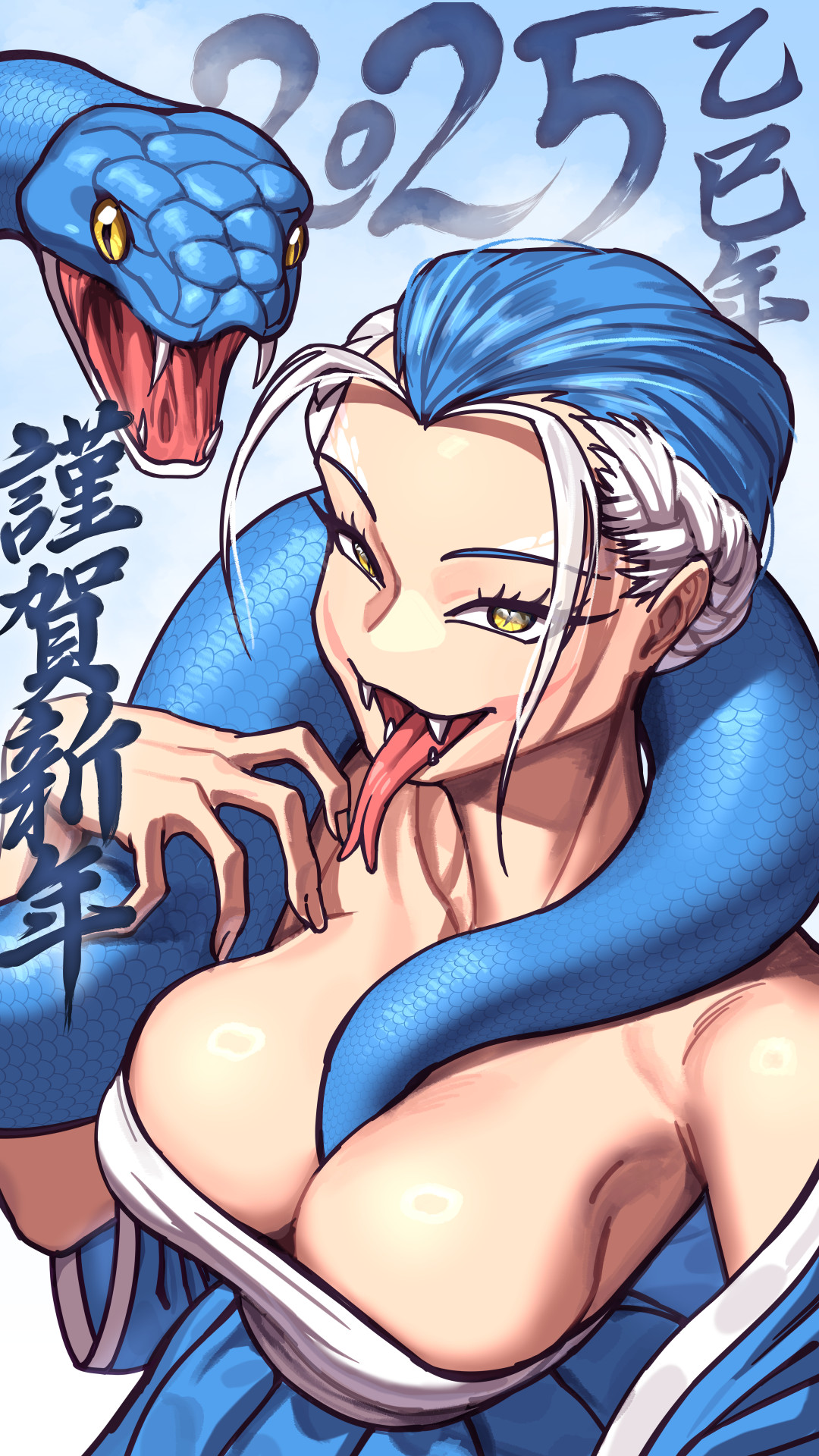 1girlbetween breastsbreastscleavageforked tonguelarge breastslong tonguelooking at viewersnaketongue