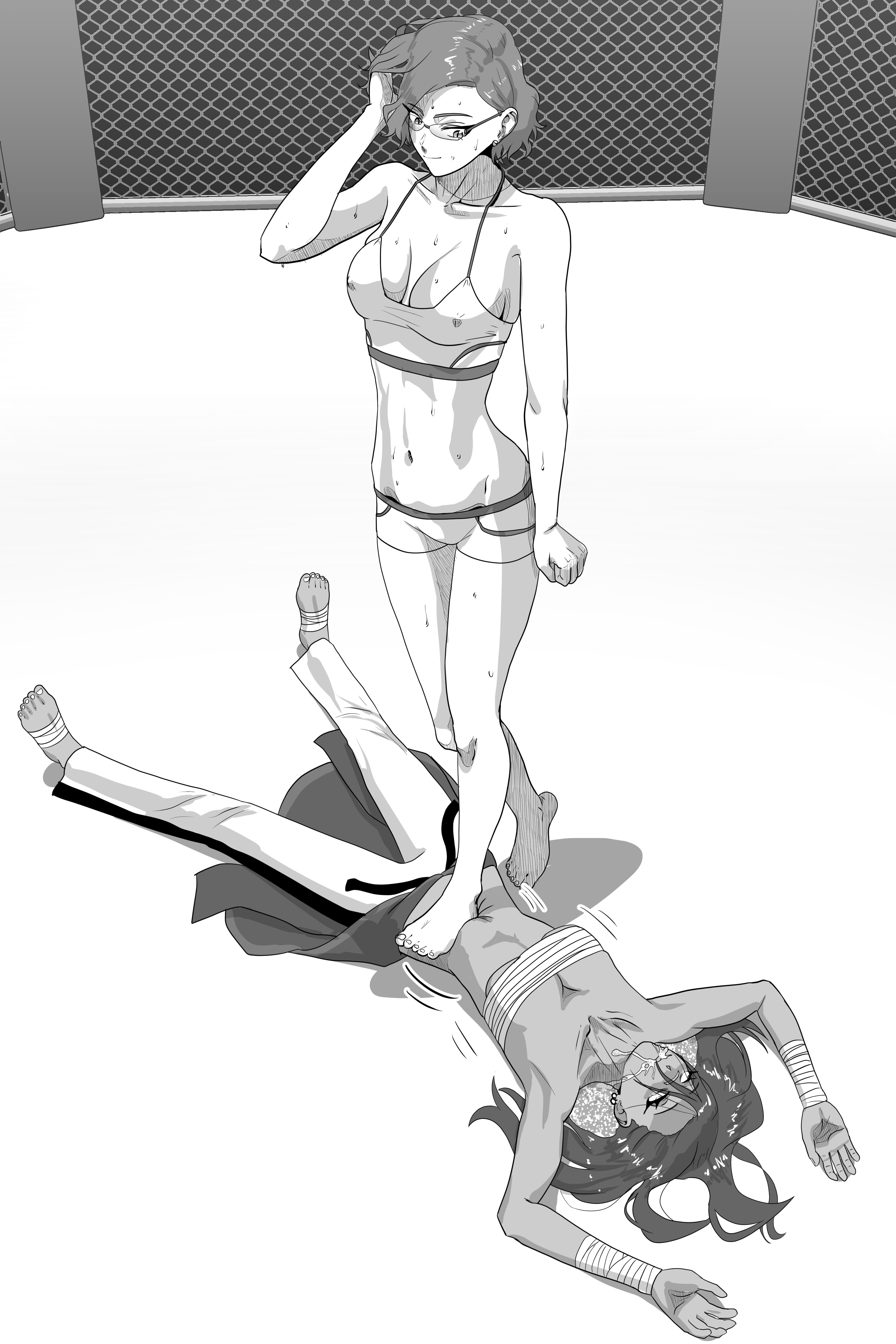 2girlsbreastscatfightcleavagecovered erect nipplesdefeatglassesmonochromemultiple girlssmilesweatsweatdrop
