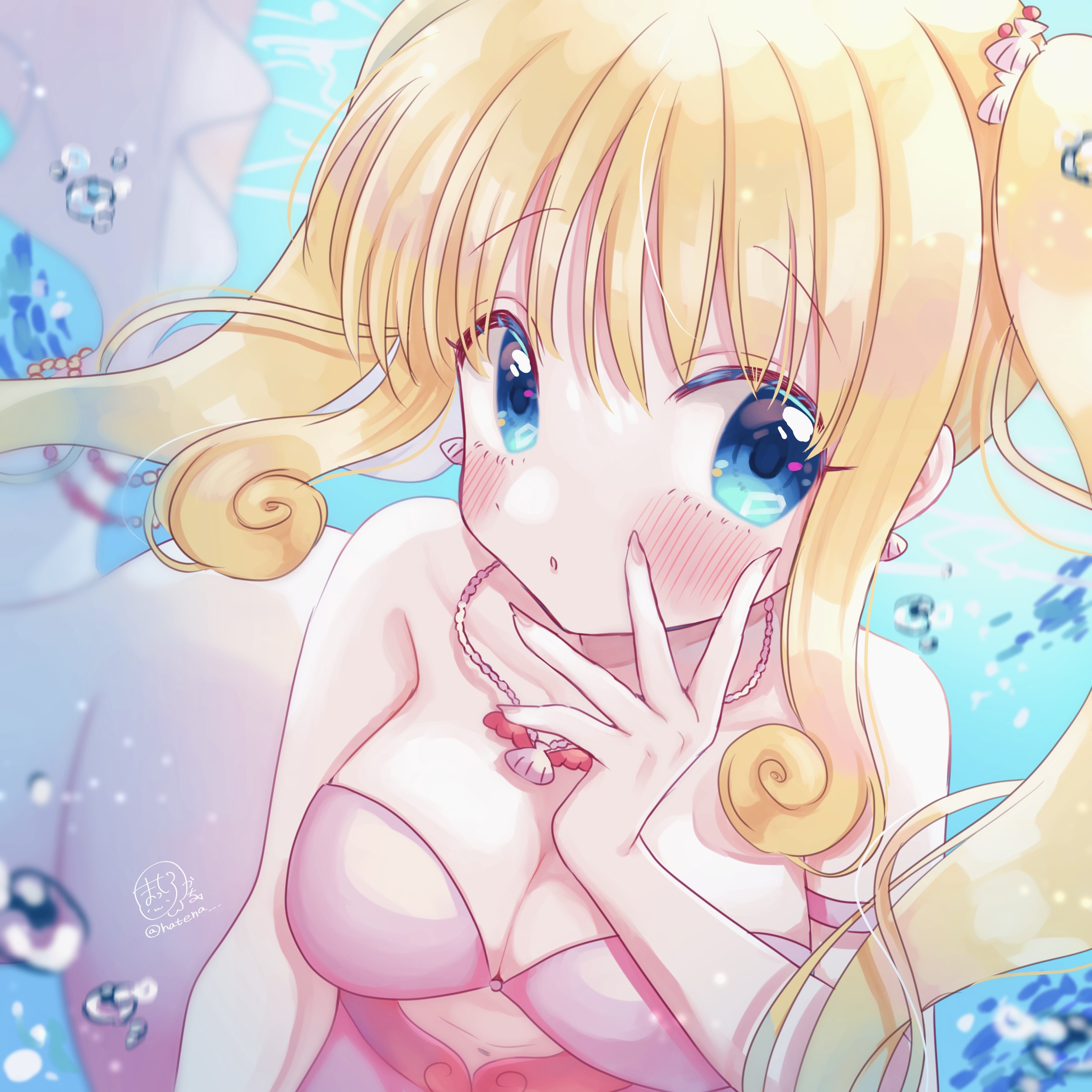 1girlarmletblonde hairblue eyesblushbreastscleavagecollarboneearringshair between eyeshair ornamentjewelrylong hairlooking at viewermedium breastsmermaidmonster girlnavelnecklaceparted lipsshellshell earringsshell necklacesolostomachtwintailsunderwatervery long hair