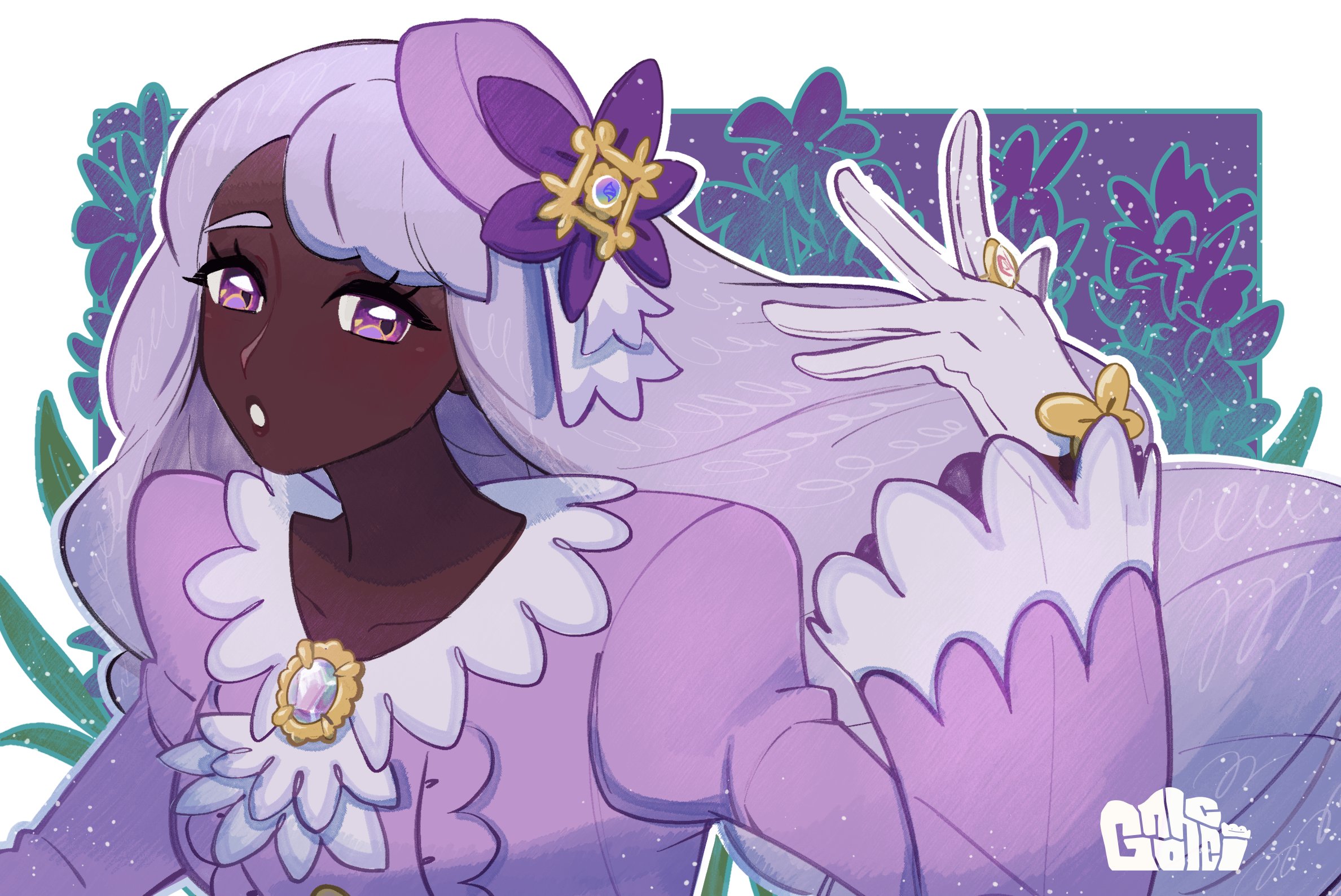 :o1girlascotbroochdark skindark-skinned femaledressfascinatorfrilled ascotfrilled sleevesfrillsglovesgold ringhand upjewelrylong hairlooking at viewermega stoneparted lipspurple dresspurple eyespurple hairsoloupper bodyvery dark skinwhite gloves