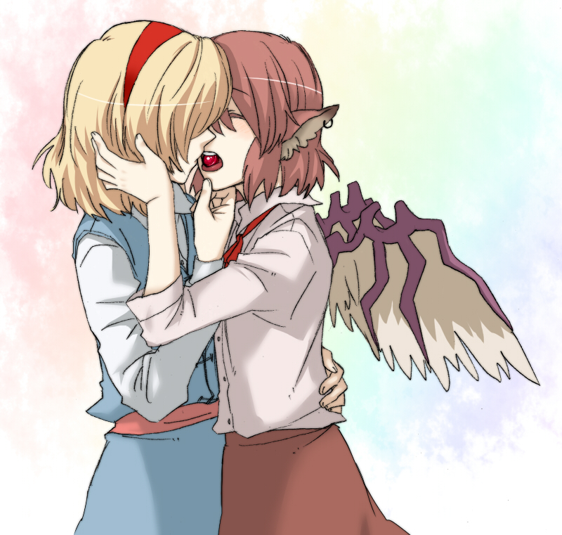 2girlsalternate costumeanimal earsblonde hairblushclosed eyescontemporaryearringsfemale focusgrabbing another's chinhairbandhand on another's chinimminent kissjewelrykissmultiple girlspink hairshort hairwingsyuri
