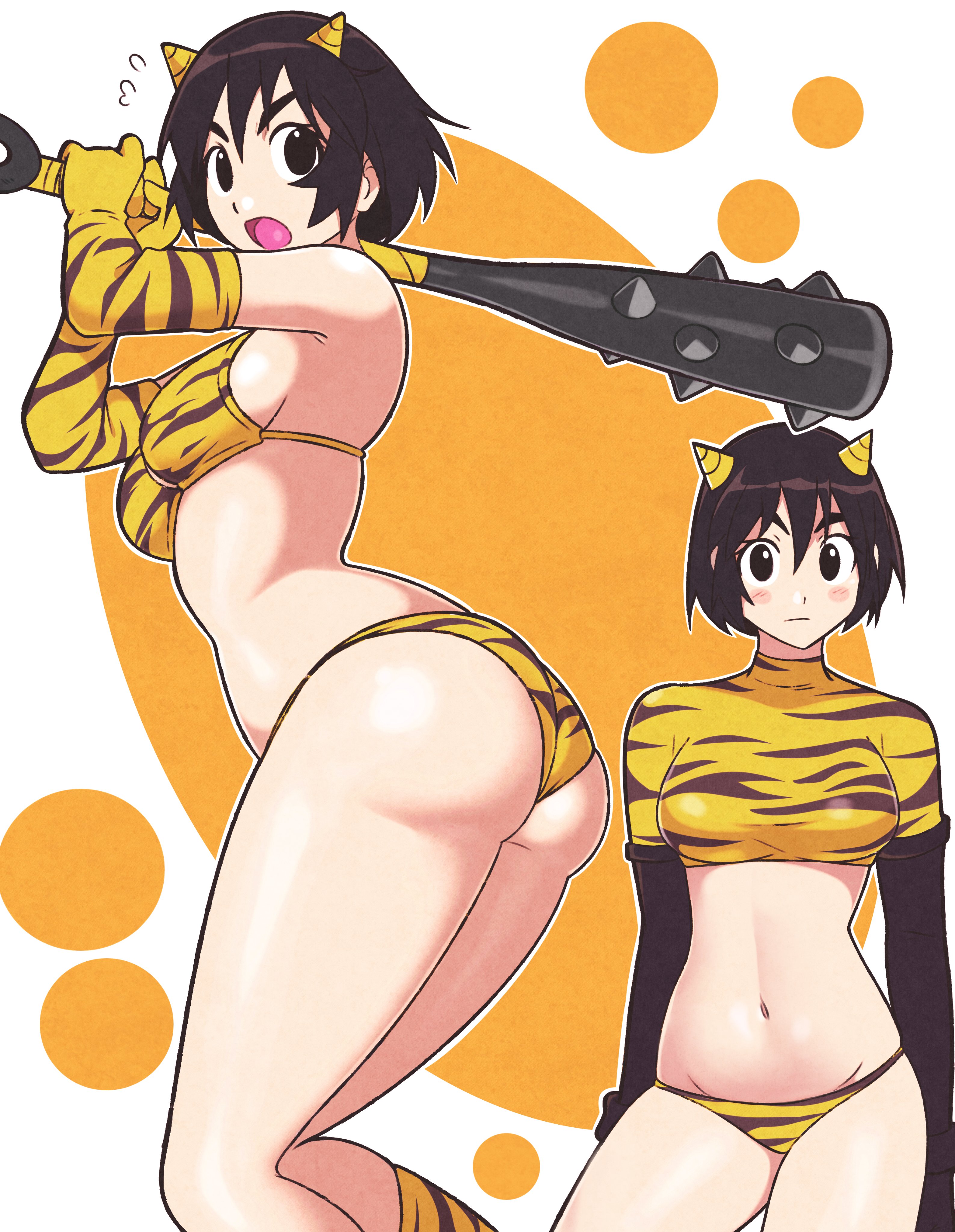 1girlanimal printassblushbreastselbow glovesfake hornsgloveshornslarge breastsnarrow waistopen mouthshort hairthongtiger print