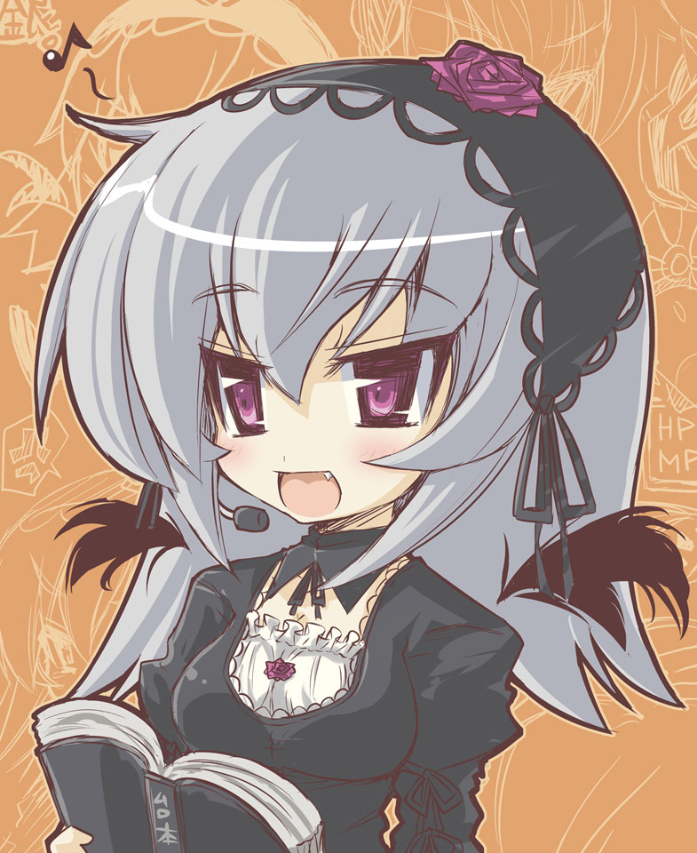 00s1girlbookfangfemale focushairbandmicrophonemusicmusical notepurple eyesquaversingingsolowings