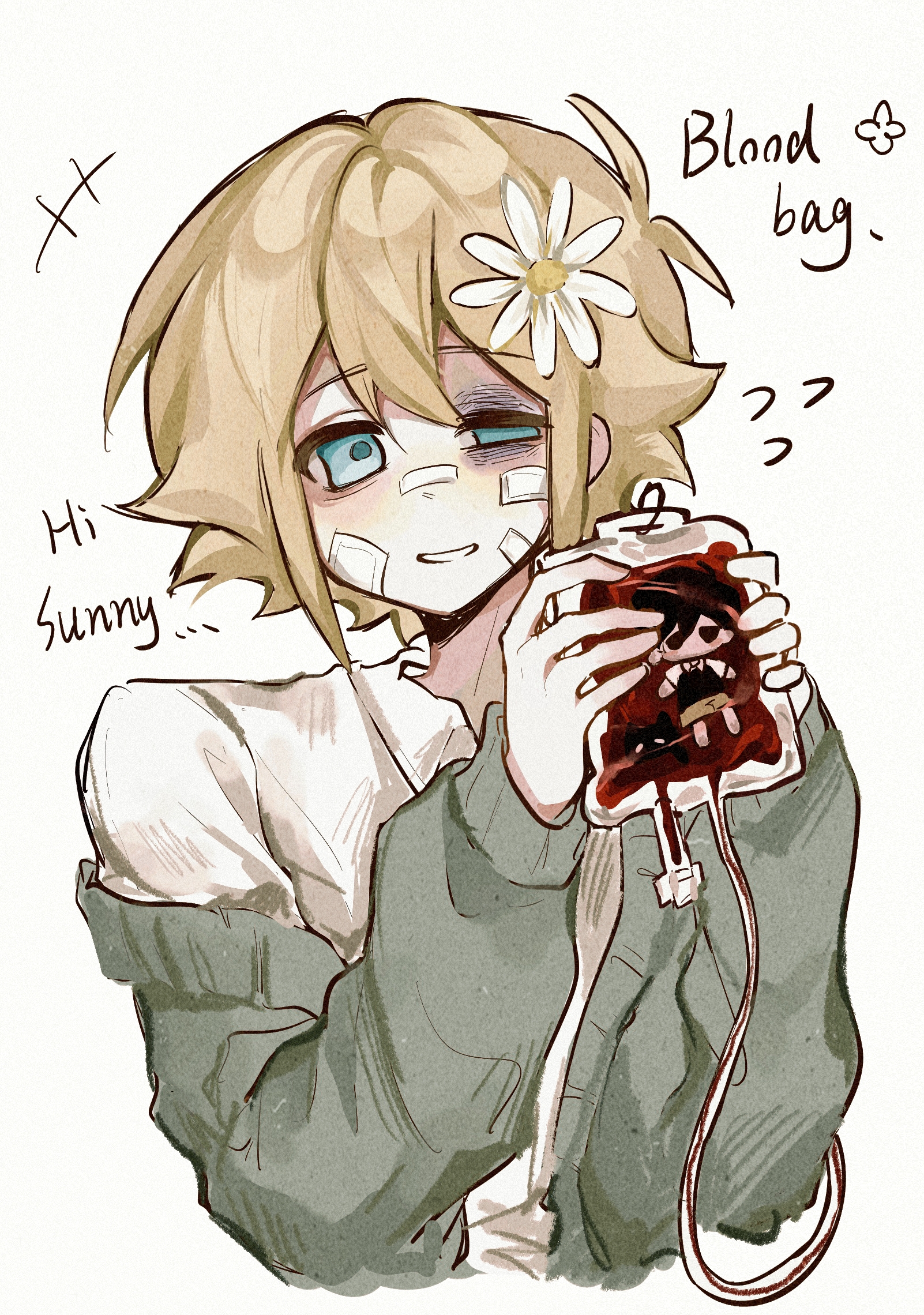 1boyalternate costumeantenna hairbandaidbandaid on cheekbandaid on facebandaid on noseblonde hairbloodblood bagbruisebruised eyecardigancollared shirtdouble-parted bangsenglish textflowergreen cardiganhair between eyeshair flowerhair ornamentinjurylong sleeveslooking at viewerluoqiloveguangyumale focusparted lipsshirtshort hairsidelockssimple backgroundsmilesoloupper bodywhite backgroundwhite shirt