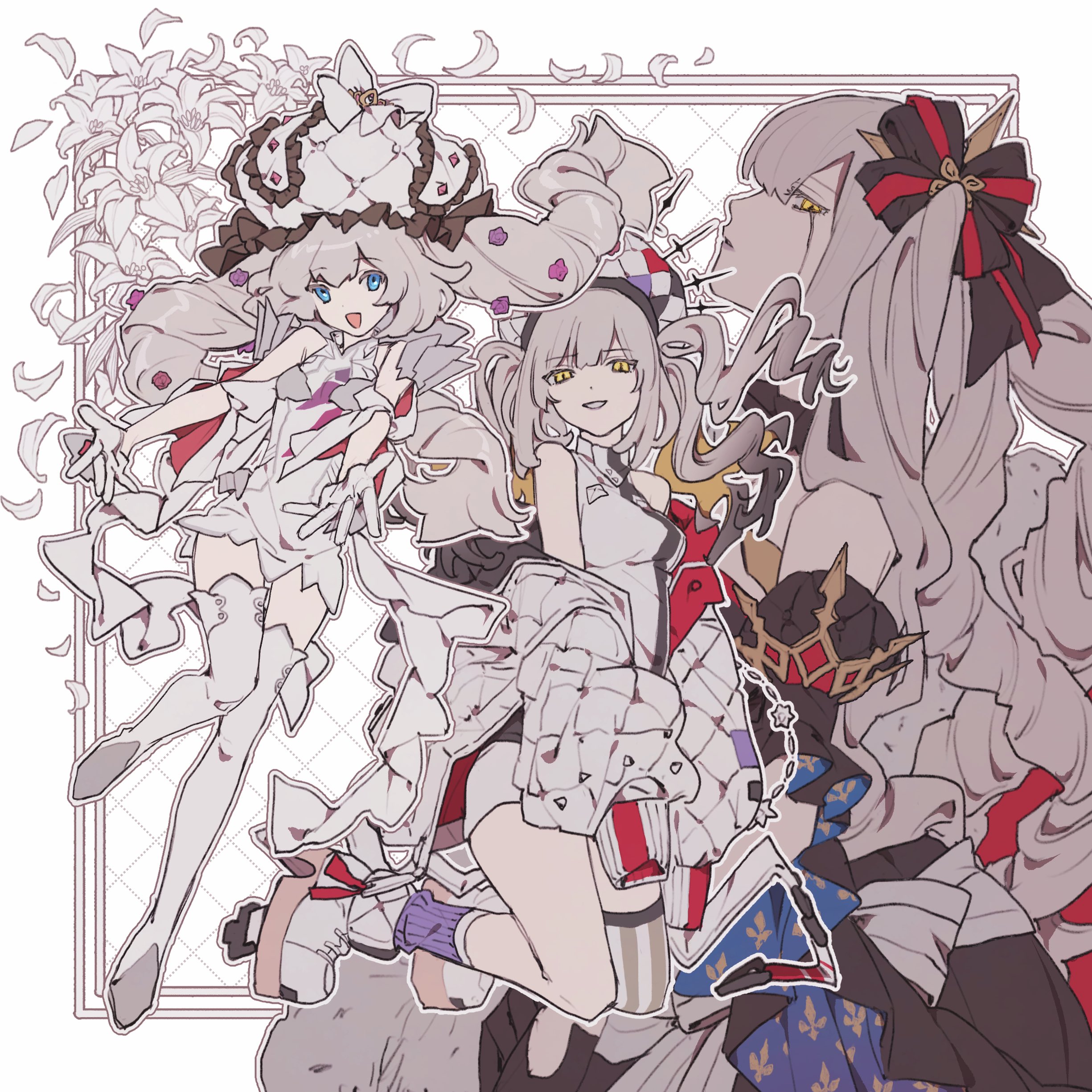 :d3girlsasymmetrical legwearbare shouldersblack dressblack hairblack tearsblonde hairblue eyesbootsborderbowcolored inner haircryingcrying with eyes opendetached sleevesdown jacketdressfleur-de-lisfleur-de-lis printflowerglovesgradient hairhair flowerhair ornamenthathat bowjacketkneelinglarge hatlily (flower)long sleeveslooking at viewermulticolored hairmultiple girlsmultiple personaoff shoulderone side upopen mouthoutlineoutside borderoutstretched armsoutstretched handparted lipspetalspurple flowerpurple socksringletsshoesshort dresssingle socksingle thighhighsleevelesssleeveless dresssmilesocksstriped clothesstriped thighhighstearsthigh bootsthighhighsturtleneckturtleneck dresstwintailsvertical-striped clothesvertical-striped thighhighswhite backgroundwhite bootswhite bowwhite dresswhite gloveswhite hairwhite hatwhite jacketwhite outlinewhite shoesyellow eyes