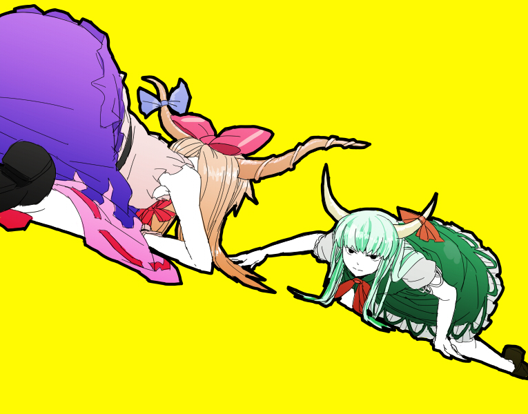 2girlsall foursbattleblonde haircaved (touhou)dutch anglefemale focusgreen hairhair ribbonhorn ornamenthorn ribbonhornslong hairmultiple girlsoniribbon