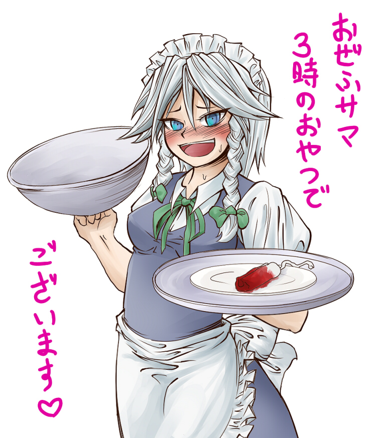 1girlbloodblue eyesblushbraidfemale focusmaidmenstrual bloodmenstruationserving domesolotampontraytwin braids