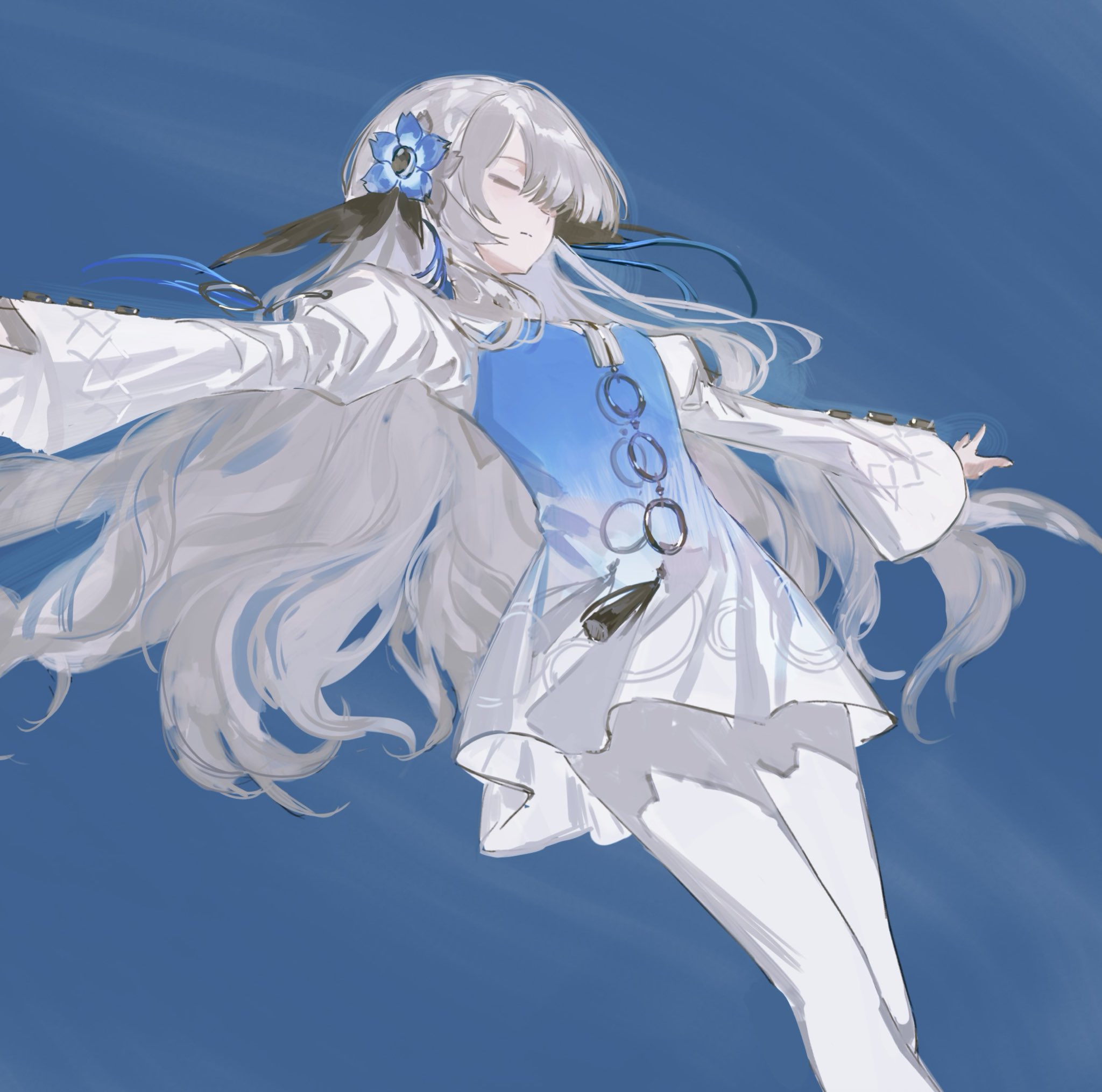 1girlblue hairclosed eyesdressexpressionlessfloating hairflowergrey hairhair flowerhair ornamentlong hairmulticolored hairoutstretched armspantyhosesolospread armstwo-tone hairvery long hairwhite pantyhose