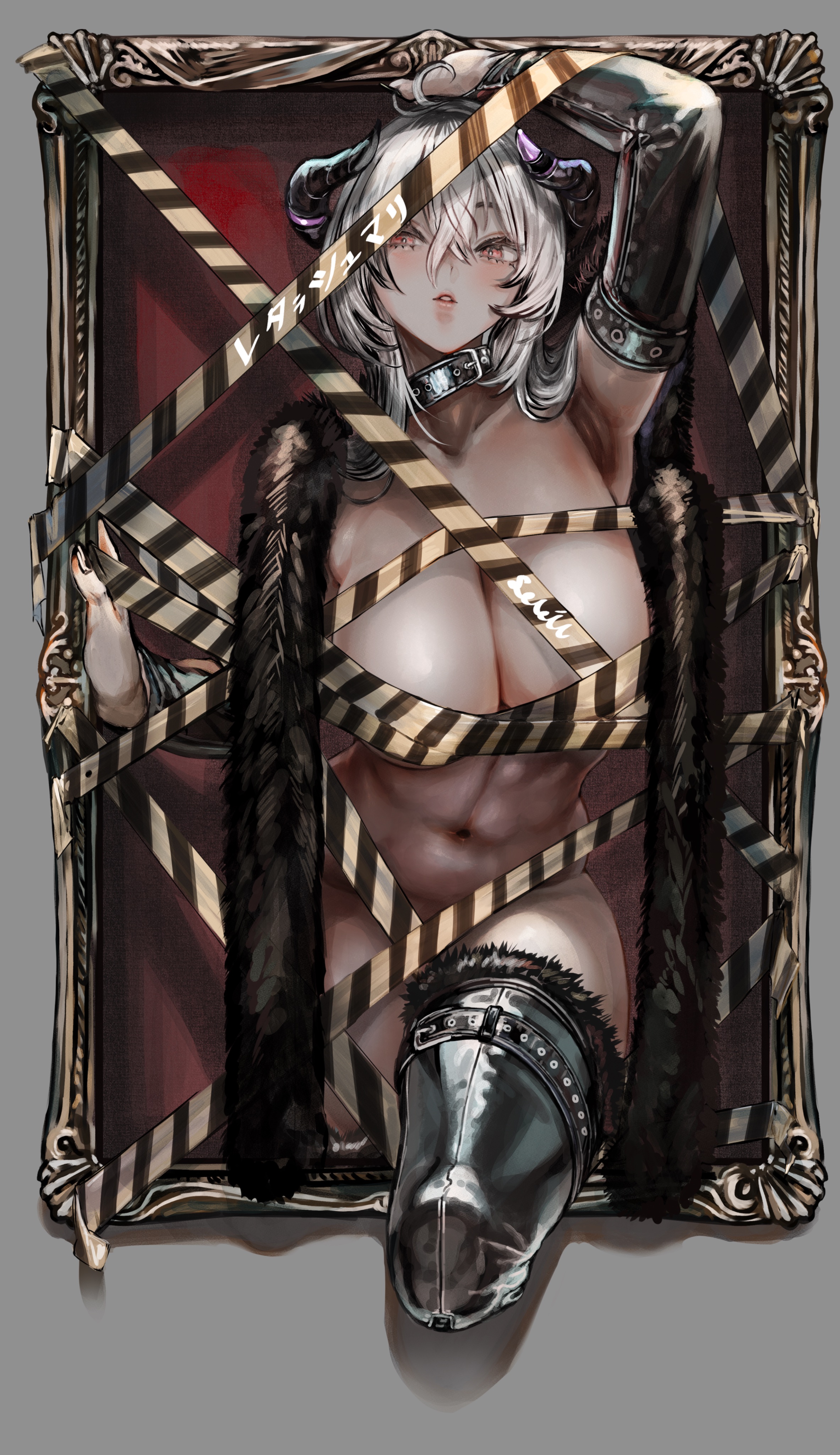 1girlarm uparmpitsbelt collarblack nailsbreastschokercollarcrossed bangsdemon hornsdetached sleevesfur trimfur-trimmed thighhighshair between eyeshair over shoulderhornshuge breastslatexlatex sleeveslatex thighhighslipslong hairlooking at viewernavelnudeparted lipspicture framered eyessidelockssolostomachstrapthighhighswhite hair