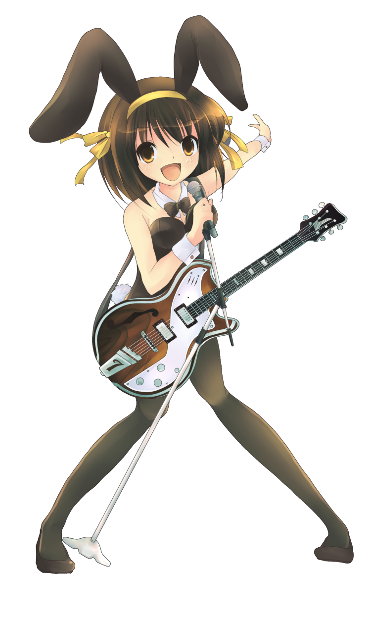 00sanimal earsblack bowblack bowtieblack pantyhosebowbowtiebrown eyesbrown hairdetached collarfake animal earsguitarhairbandinstrumentmicrophonemicrophone standpantyhoseplayboy bunnyrabbit earsshort hairsolowrist cuffs