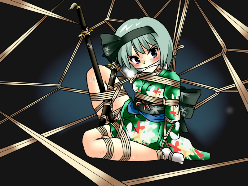 1girlbdsmbondageboundcleave gagcloth gagfemale focusfrogtiegaggaggedimprovised gagjapanese clotheskatanakimonosoloswordweapon