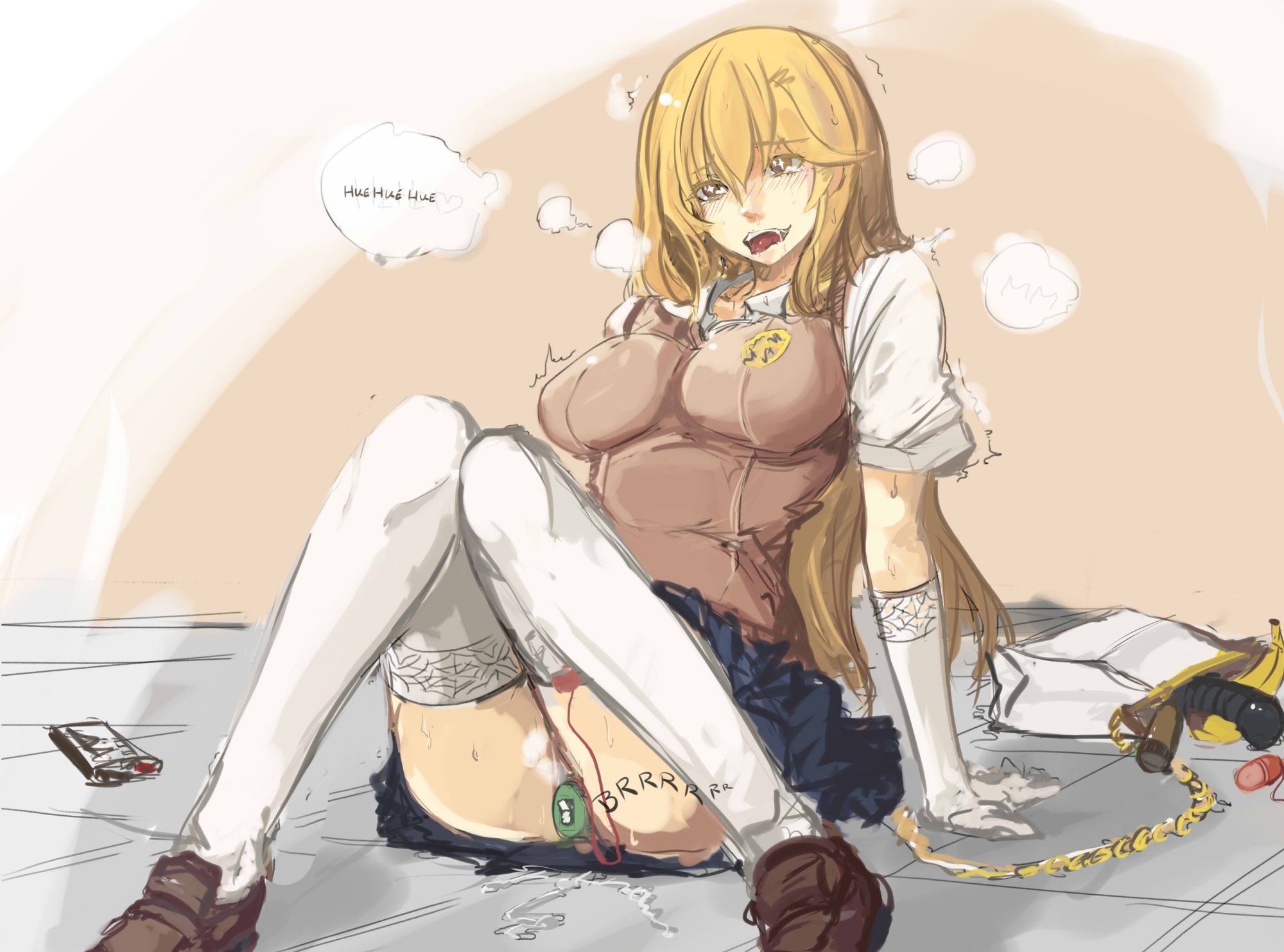 blonde hairelbow glovesfemaleFlag for Deletiongloveslong hairschool uniformsolosweater vestthighhighsvibratorwhite glovesyellow eyes