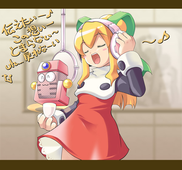 1girlblonde hairclosed eyesfemale focushair ribbonlong hairmusicponytailred skirtribbonsingingskirtsolo