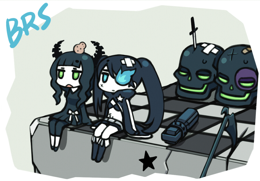 10s2girlsarm cannonbandagesbandaidblack leggingsblue eyesbruisebruised eyecapecheckered floorchibicrossed bandaidsglowingglowing eyesgreen eyesgunhead bumphornsinjuryleggingsmultiple girlsscarscythesittingskullstar (symbol)swordtwintailsweapon