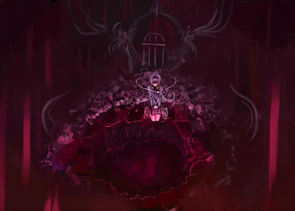 1girlcheckered floordarkfemale focusfloorflowergatehair over eyesholekneelingpurple hairpurple themeshort hairskirtsolostatuethird eyewings