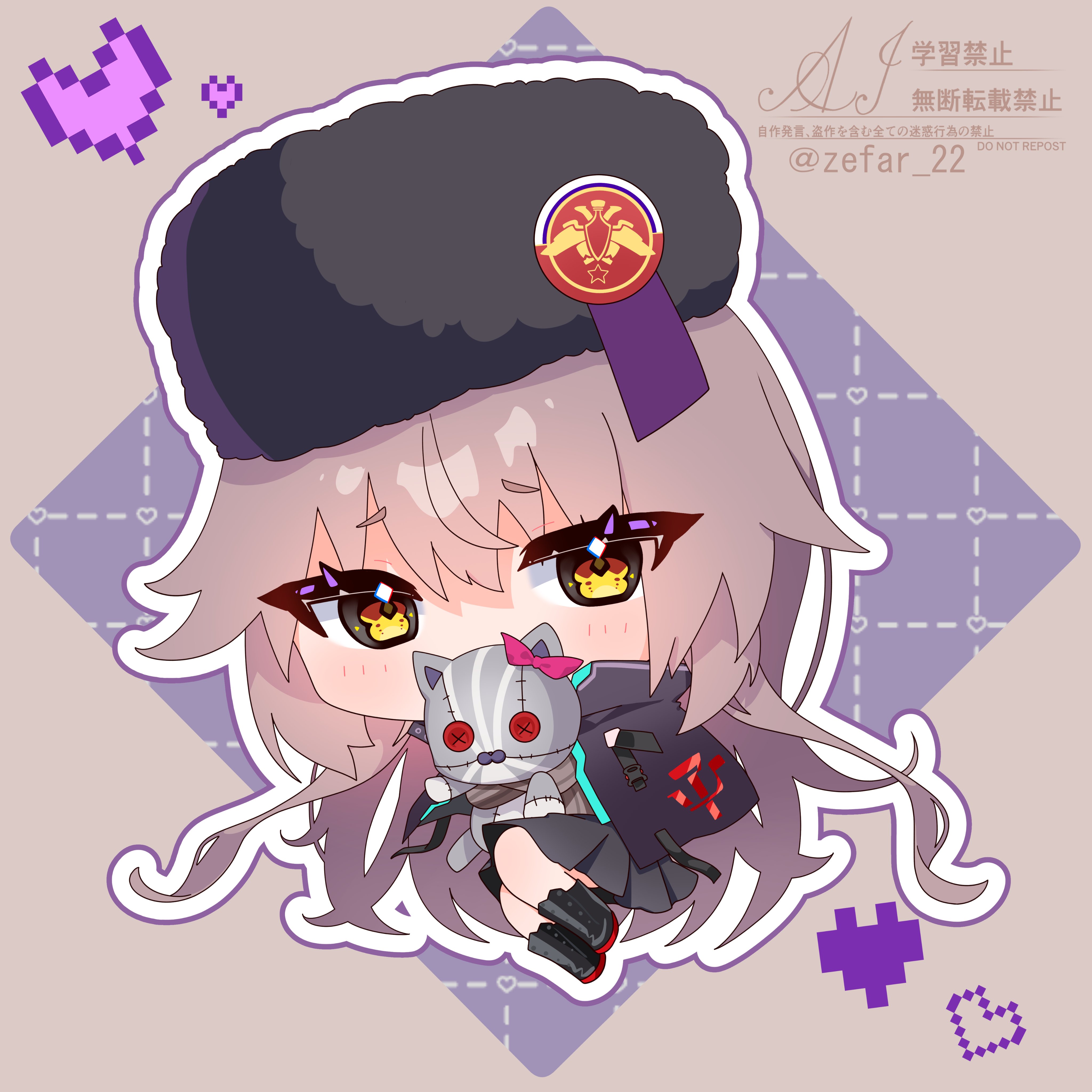 1girlblack jacketblack skirtblushbootsbrown eyesbrown hairbutton eyesbuttonschibicoatcovered mouthdotted linefull bodyfur hatgrey hairhair between eyeshatholdingholding stuffed toyjacketlong hairlooking at vieweroutlinepleated skirtskirtsolostuffed animalstuffed catstuffed toytwitter usernameushankawhite outlineyellow eyes