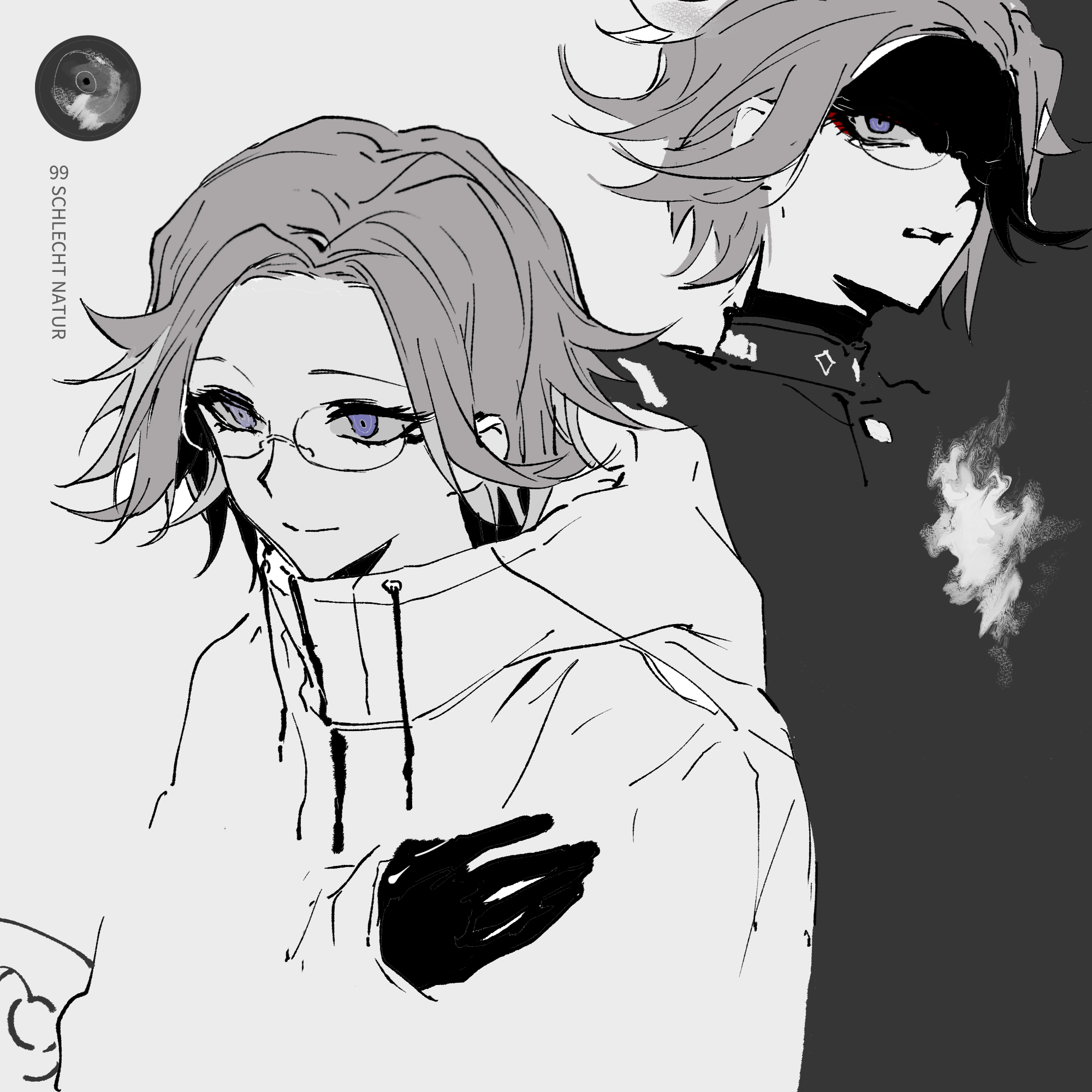 1boyangryblue eyesclosed mouthdrawstringeyelashesglassesglovesgreyscalehand on own chesthigh collarjacketlast defense academy school uniformlong sleevesmale focusmonochromemultiple viewsschool uniformshaded faceshort hairsmilespot color