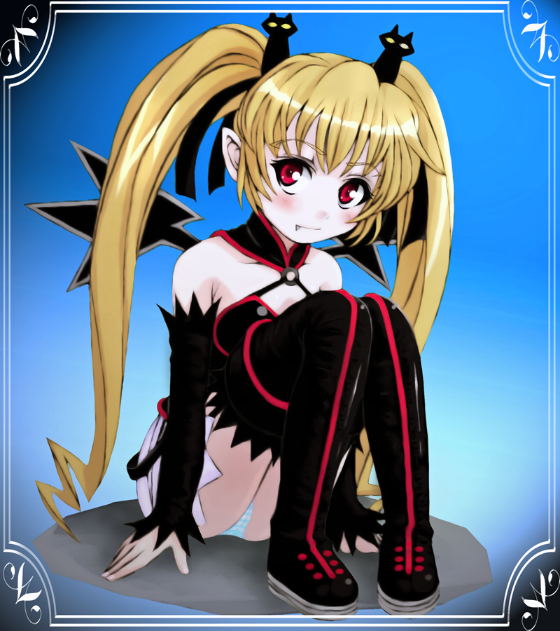 bare shouldersblonde hairblushbootsfanglong hairpantiespantyshotpointy earsred eyessittingskirtsolostriped clothesstriped pantiesthigh bootsthighhighstwintailsunderwearwings