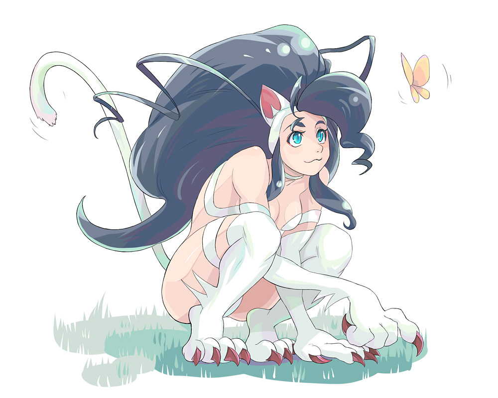 1girlanimal earsanimal handsbig hairblue eyesblue hairbugbutterflycat earscat tailfemale focusinsectlong hairmatching hair/eyessolotailthighhighs