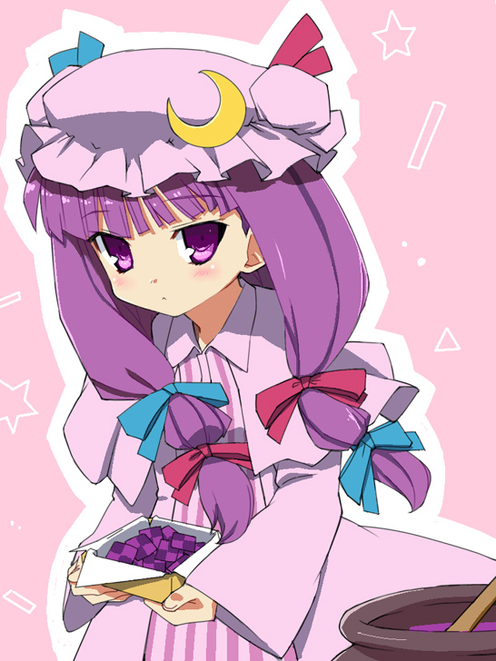 1girlblushbowcookiecrescentfemale focusfoodhair ribbonhatlong hairpink bowpurple eyespurple hairribbonsolowhite day