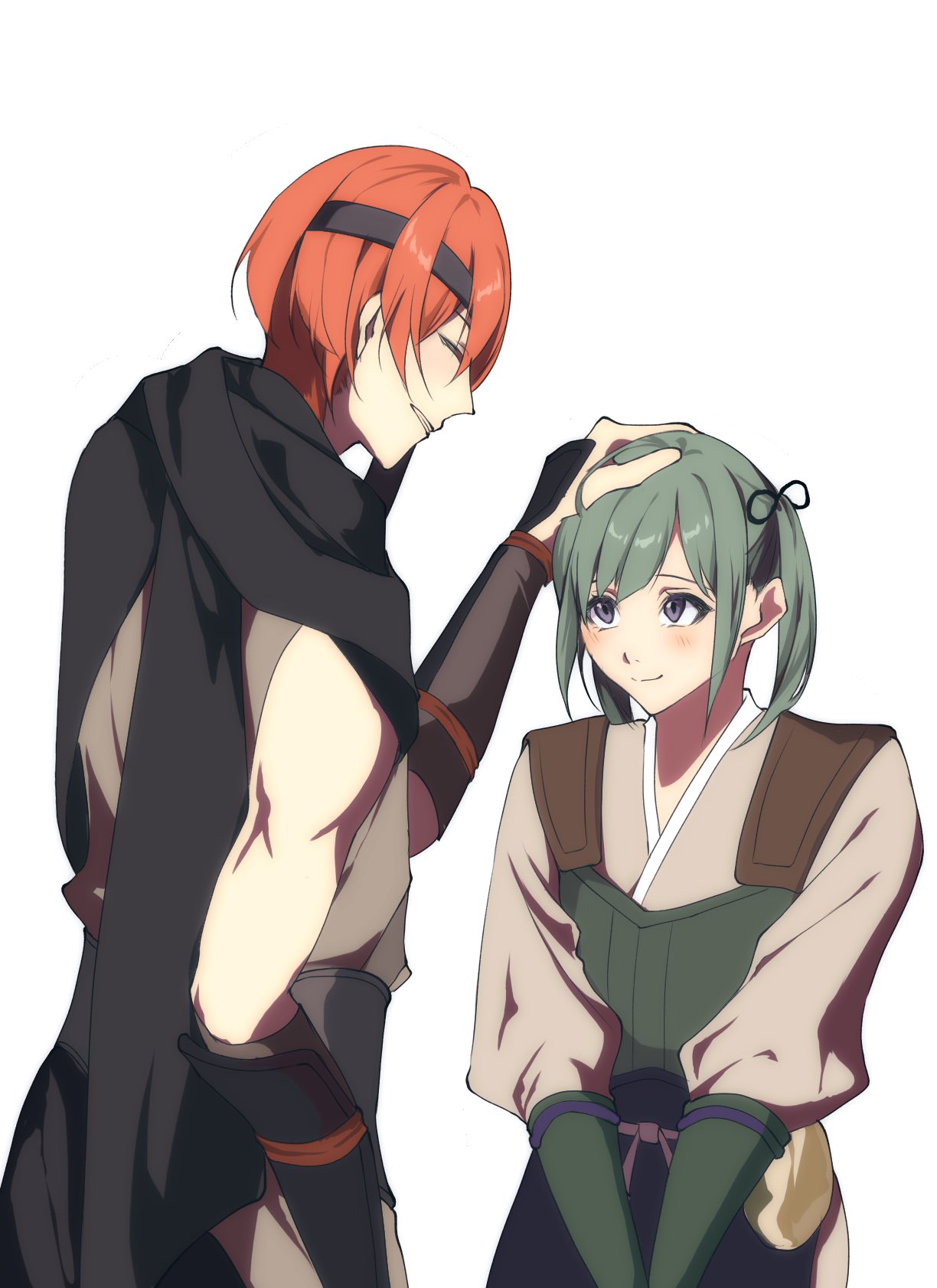 1boy1girlcousinsgreen hairheadpatjapanese clotheslooking at anotherorange hairpurple eyessaki ttxtwintailsupper body