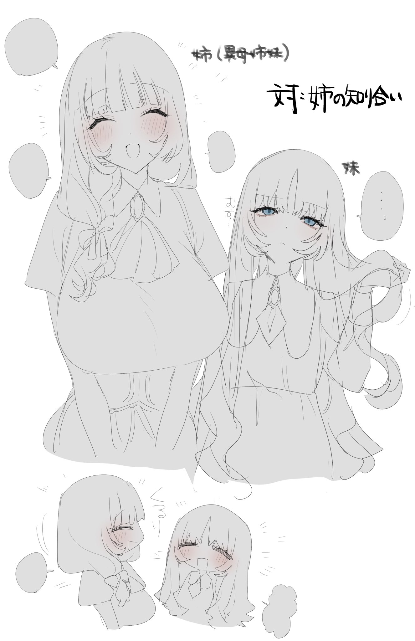 :d1boy2girlsascotblank speech bubbleblue eyesblunt bangsblushbreastsbroochclosed eyesclosed mouthdressfrancoise's half-sister (eurasia)half-siblingshappy auraheight differenceholdingholding own hairjewelrylarge breastslong hairlow side ponytailmultiple girlsmultiple viewsopen mouthshort sleevessiblingssimple backgroundsisterssmilespeech bubblespot colorwhite background