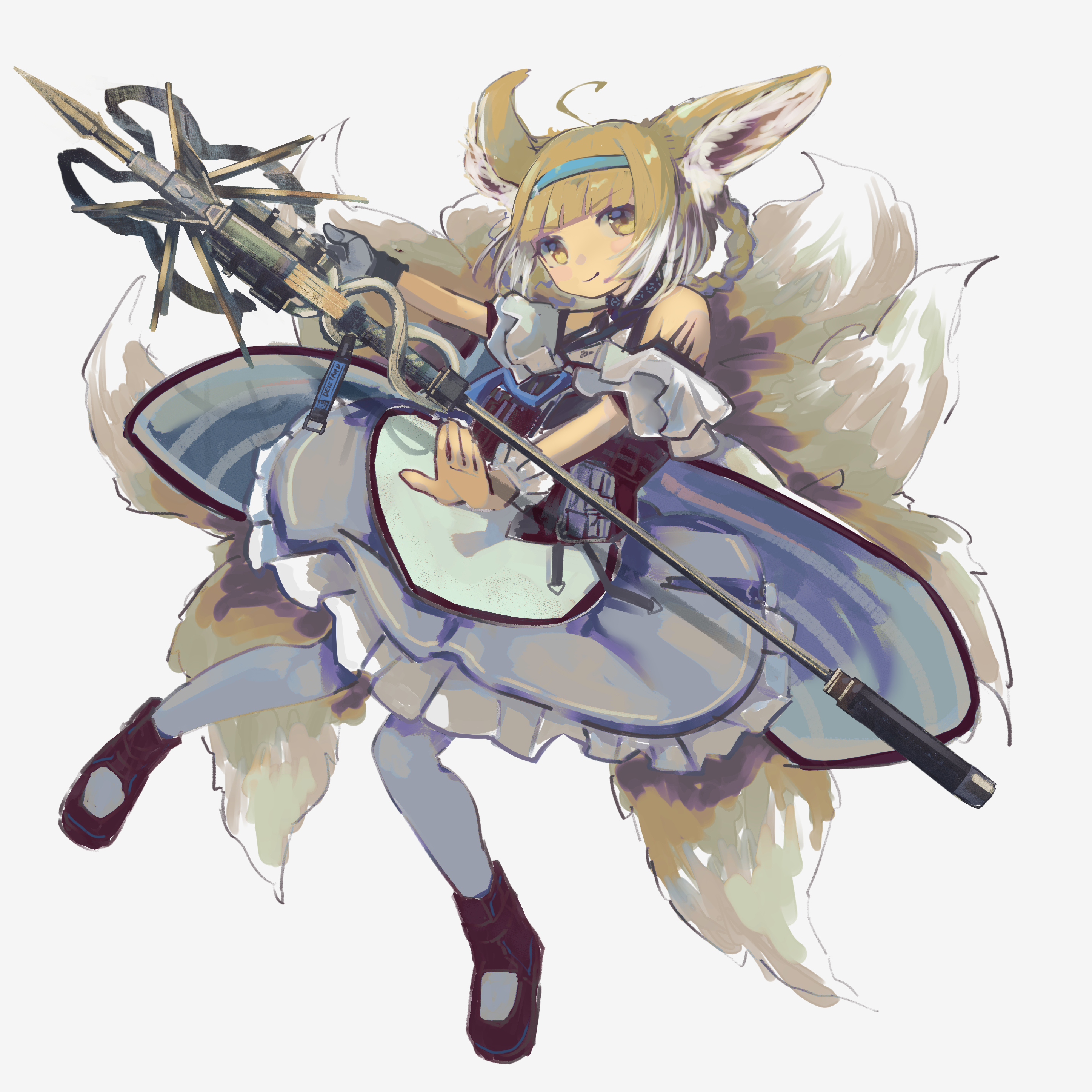 1girlanimal earsblonde hairblue hairbandfox earsfox girlfox tailhairbandholdingholding staffkitsunekyuubimaterial growthmultiple tailsoripathy lesion (arknights)pantyhosesimple backgroundsolostafftailwhite backgroundwhite pantyhose
