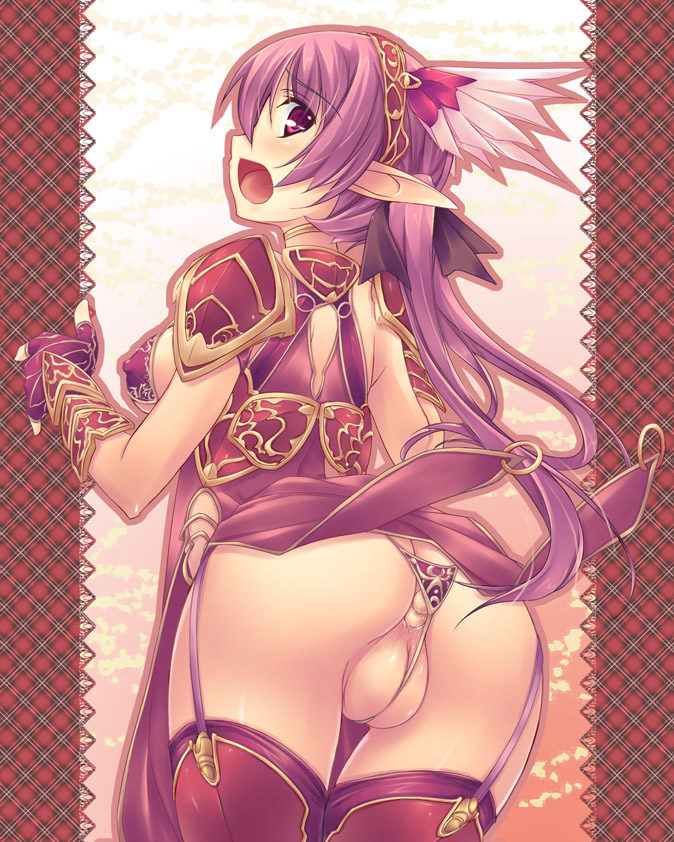 1girlanalanal beadsarmorbreastscleft of venuscovered erect nippleselffat monsfemale focusfingerless glovesgarter beltgloveslong hairlooking backopen mouthpantiespointy earspurple hairpussyred eyessex toysideboobsolothighhighsthonguncensoredunderwear