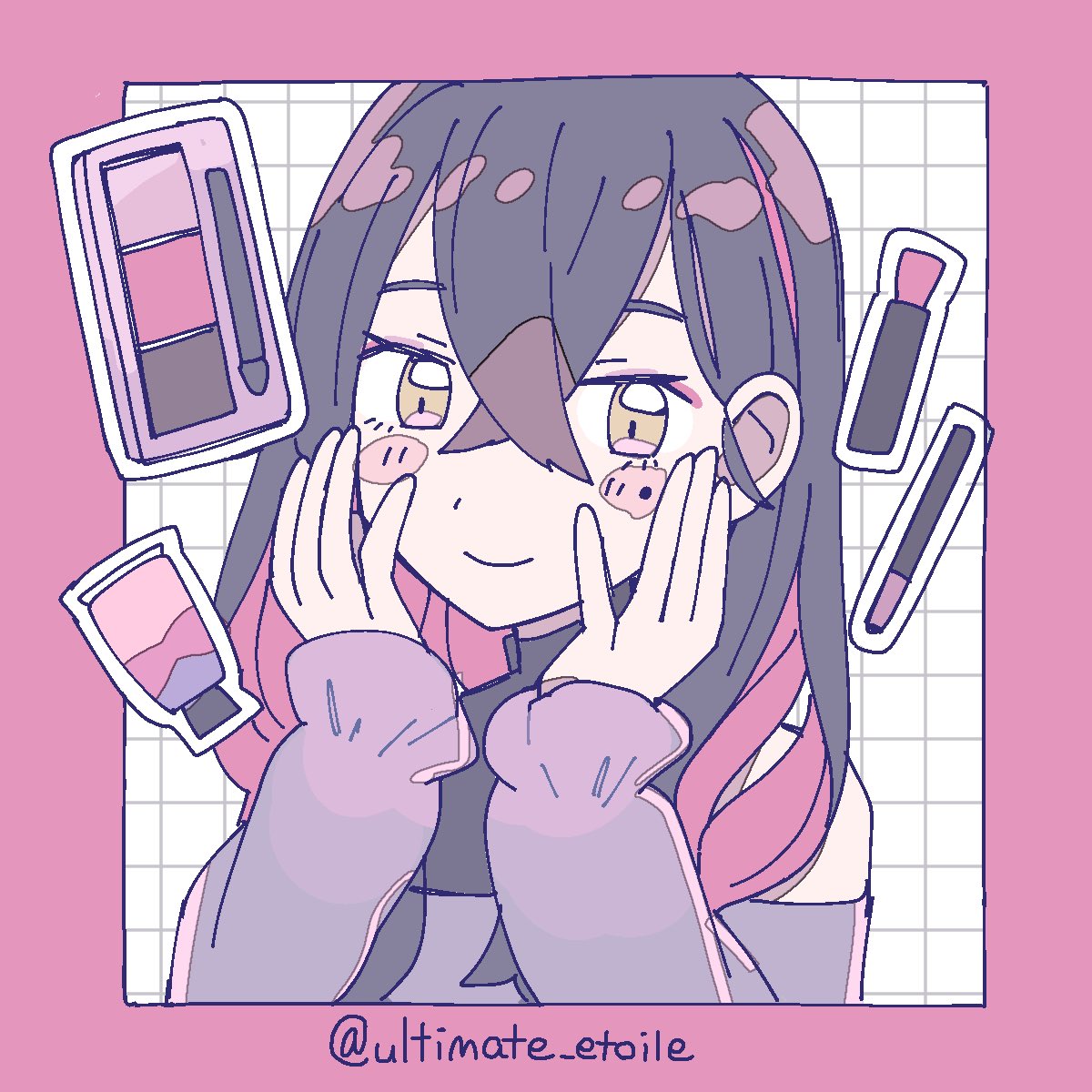 1girlblack hairblush stickersbordercolored inner haircrossed bangshair between eyeslong hairlong sleeveslooking at viewermakeupmolemole under eyemulticolored hairoff shoulderoff-shoulder shirtpink borderpurple shirtred hairshirtsimple backgroundsmilesolotwo-tone hairupper bodywhite backgroundyellow eyes