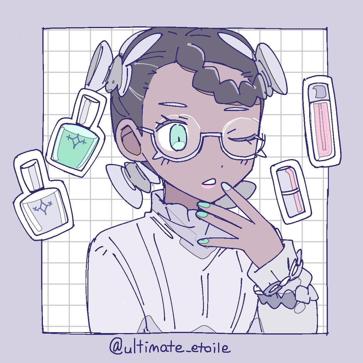 1girlblack hairbolt hair ornamentborderbraidclosed mouthcosmeticsdark skindark-skinned femaleglassesgreen eyesgreen nailsgrey bordergrey hairgrey nailsgrey shirtlong sleeveslooking at viewermulticolored hairnail polish bottleone eye closedpink lipsshirtshort hairsimple backgroundsolotwo-tone hairupper bodywhite background