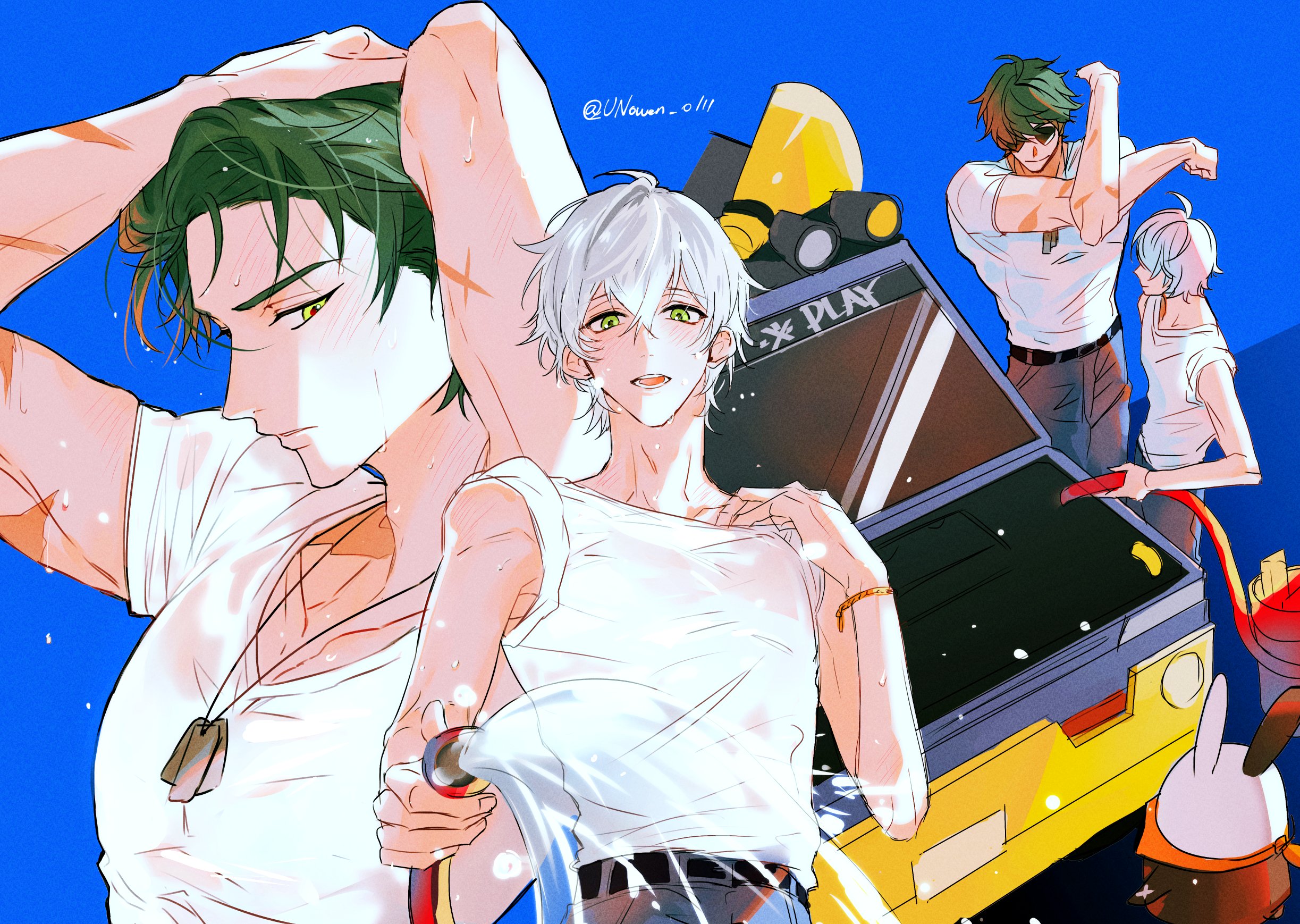 1other2boysadjusting hairbandanabeltblue backgroundblue pantsblushbraceletbucketcarclosed mouthcollarbonedog tagsgreen eyesgreen hairgrey hairhair between eyeshair over one eyehand on own chestholdingholding hosehosejewelrylooking at anotherlooking at viewermotor vehiclemultiple boysopen mouthorange bandanapantspectoralsred pupilsscarscar on armsee-through clothessee-through shirtshirtshort hairsleeves rolled upsplashingspongestretchingsunglassessweattwitter usernameunowen 0111washing vehiclewaterwetwet clotheswet shirtwhite shirtyaoi