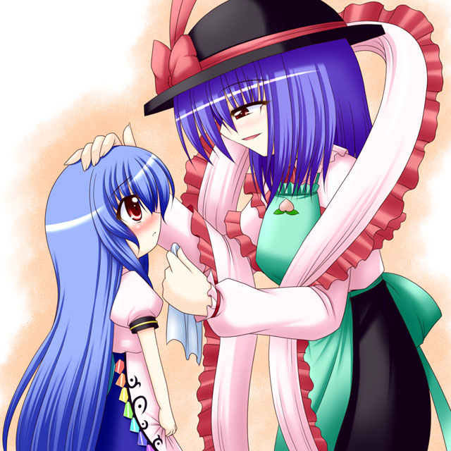 2girlsapronblue hairblushfemale focusfoodfrillsfruithatmultiple girlsno headwearpeachpurple hairred eyestears