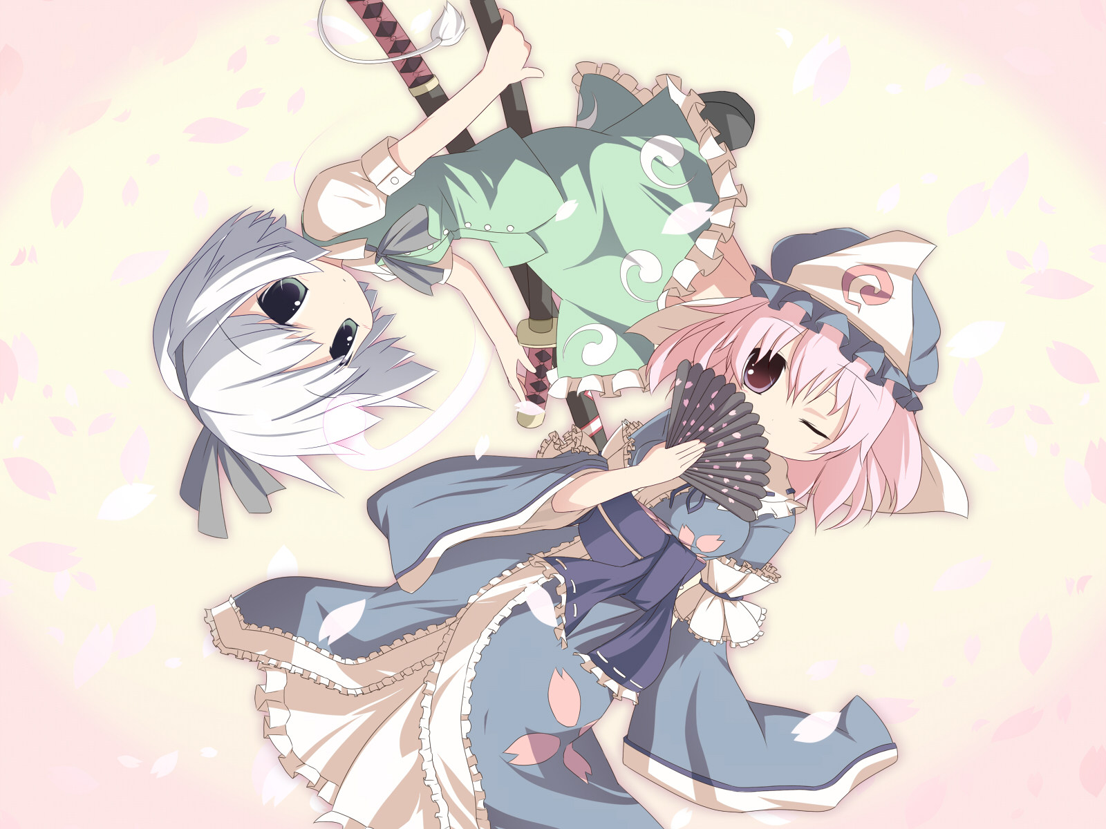 2girlsfemale focusghostgreen eyeshairbandhand fanhathitodamakatanamultiple girlsone eye closedpink eyespink hairribbonswordweaponwink