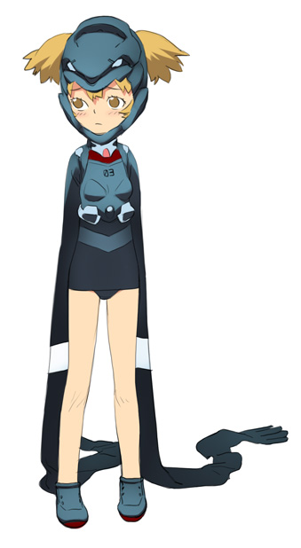 1girlbrown haircosplayfemale focushelmetleotardshort hairsimple backgroundsolostandingtwintailswhite background