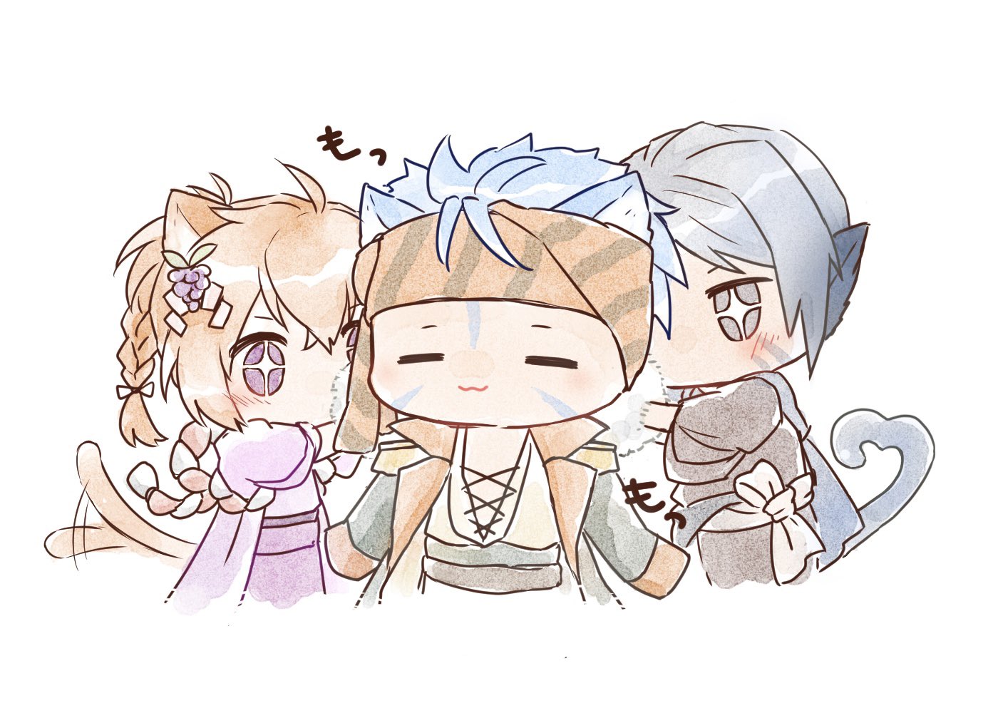 1girl2boysanimal earsbandanablue haircat boycat earscat girlchibichibi onlycoatcoat on shoulderscross-laced clothescross-laced topjapanese clothesmultiple boysofficial alternate costumepirate costumeshort hairsimple backgroundtailwhite background