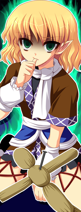 1girlbitingbiting own thumbblonde hairfemale focusgloom (expression)green eyespointy earssolostraw doll