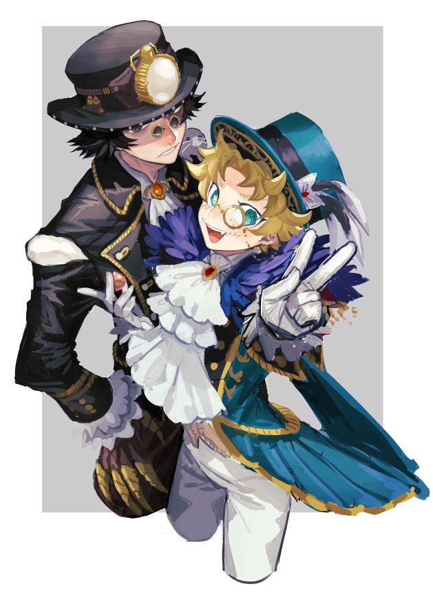 tsuzuki xox, ivan (alien stage), till (alien stage), alien stage, commentary request, highres, 2boys, bento, black hair, black jacket, black necktie, chair, chopsticks, closed eyes, collared shirt, cup, diagonal-striped clothes, diagonal-striped necktie, food, green eyes, green hoodie, grey hair, headphones, headphones around neck, holding, holding food, holding sandwich, hood, hoodie, jacket, jacket over hoodie, juice box, long sleeves, male focus, multiple boys, necktie, official alternate costume, on chair, rice, sandwich, school uniform, shirt, short hair, sitting, striped clothes, table, very short hair, white shirt