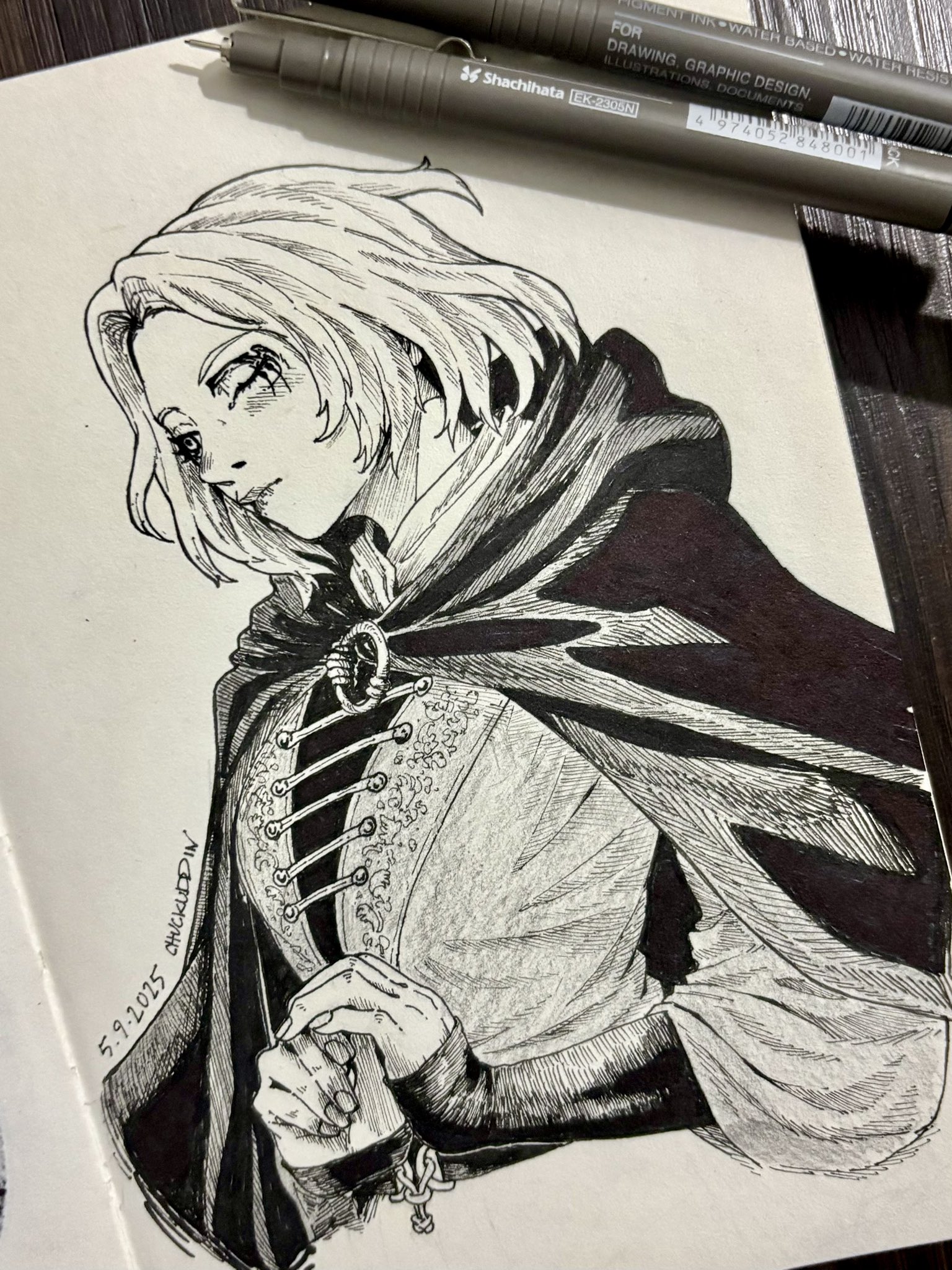 artist request, lowres, 1girl, detached sleeves, dress, female focus, frills, goth fashion, lace, long hair, monochrome, profile, simple background, solo, spot color