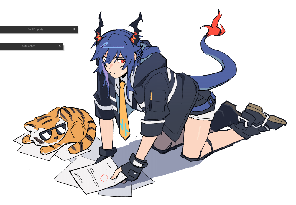 1girlblack glovesblack shoesblue haircollared shirtdragon girldragon hornsdragon tailfingerless glovesfull bodygloveshair between eyesholdingholding paperhoodhood downhornsjacketkneelinglong hairlooking at viewernecktieorange necktiepaperred eyesshadowshin guardsshirtshoesshortssidelockssolosunglassestailtigerwhite shirt