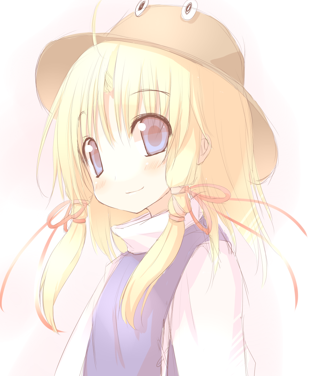 1girlblonde hairblue eyesfemale focusgradient backgroundhair ribbonhatribbonsketchsmilesoloupper bodywhite background