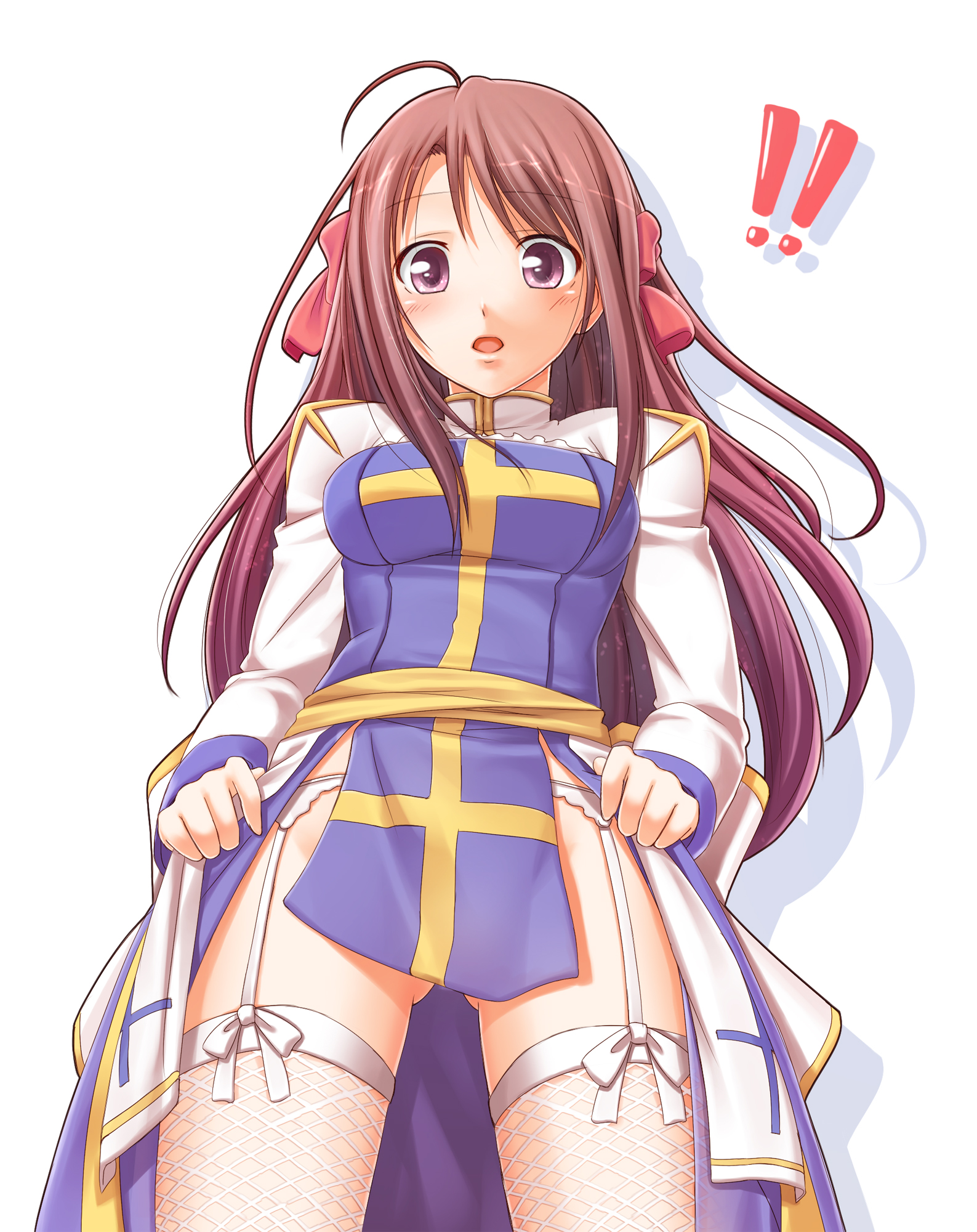 1boy1girlblushbreastsbrown eyesbrown hairfemale focusfishnet thighhighsfishnetsgarter belthair ribbonlong hairno pantiesribbonsolothighhighs