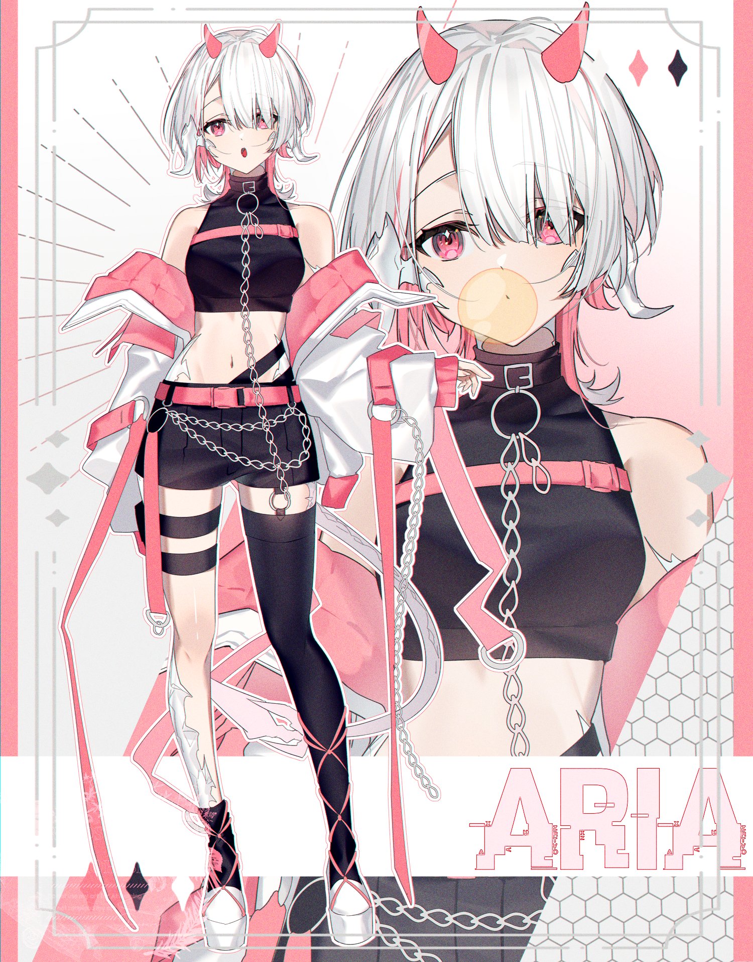 1girlasymmetrical legwearau rabare shouldersblack collarblack shirtblack shortsblack socksblack thighhighsblowing bubble gumbreastschainchewing gumcollarcrop topdragon girldragon hornsdragon tailhornsjacketjacket partially removedlooking at viewermidriffnavelplatform shoesred eyesscalesshirtshortssingle thighhighsleevelesssleeveless shirtsockssolostandingtailthighhighswhite hairwhite jacketzoom layer