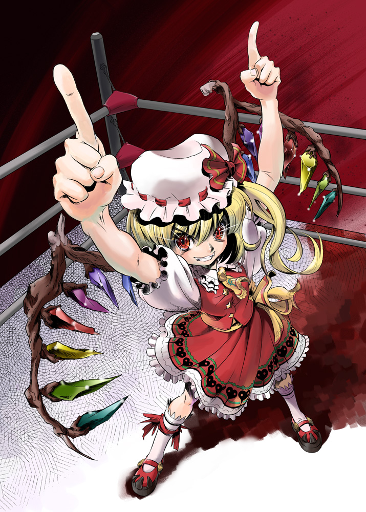 :d1boy1girlarenablonde hairboxing ringembellished costumefangsfemale focusforeshorteningfrillsfrom abovegrinhatkamina poselooking at vieweropen mouthpointingpointing upred eyesshort hairsmilesolostandingv-shaped eyebrowswings