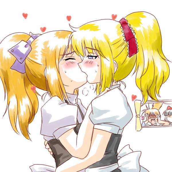 saki chisuzu, arisa bunnings, tsukimura suzuka, lyrical nanoha, mahou shoujo lyrical nanoha, 00s, 2girls, animal ears, cat ears, cat tail, maid, multiple girls, tail, thighhighs, yuri