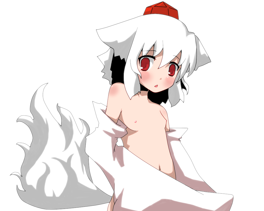 1girlanimal earsdetached sleevesfemale focusflat chesthatnavelnudered eyessimple backgroundsolotailtokin hatwhite backgroundwhite hairwolf earswolf tail