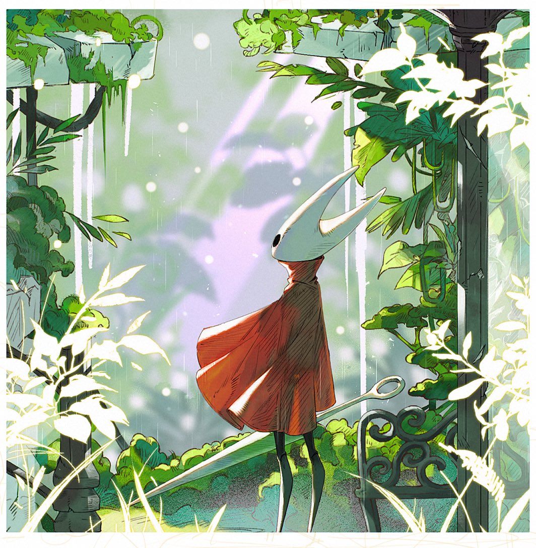 1girlbenchblack eyesblurryblurry backgroundbordercloakfoliagefull bodyhornsleaflooking aheadpin (hollow knight)red cloaksolostandingwhite border