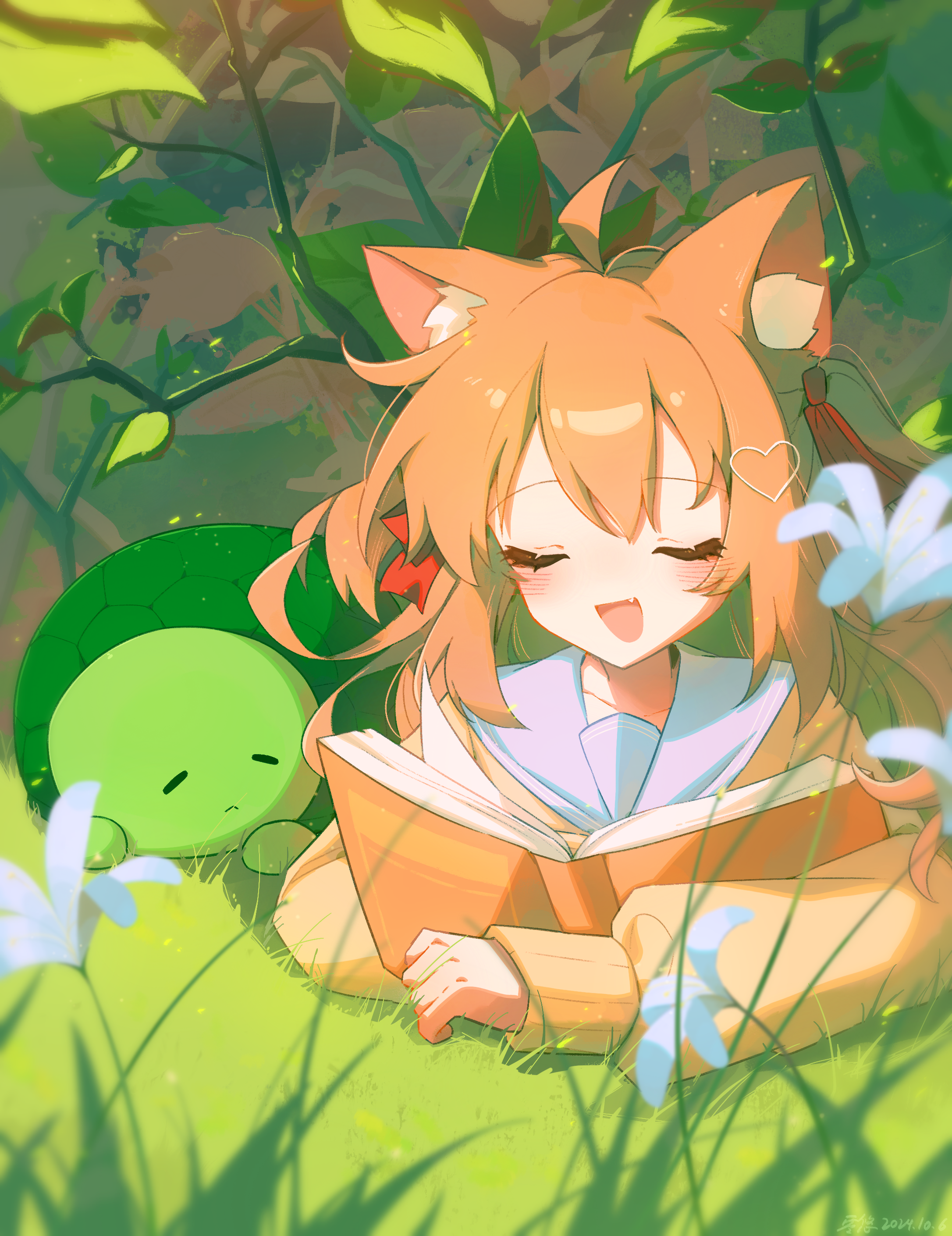 1girlahogeanimal earsblue sailor collarbookbrown haircardigancat earscat girlclosed eyesdayfangflowergrasshair between eyeshair ornamenthair ribbonheartheart hair ornamentlong hairlong sleeveslyingon stomachopen bookopen mouthoutdoorsred ribbonribbonsailor collarsunlightturtletwo side upuser hmyv8473vedal aivirtual youtuberyellow cardigan