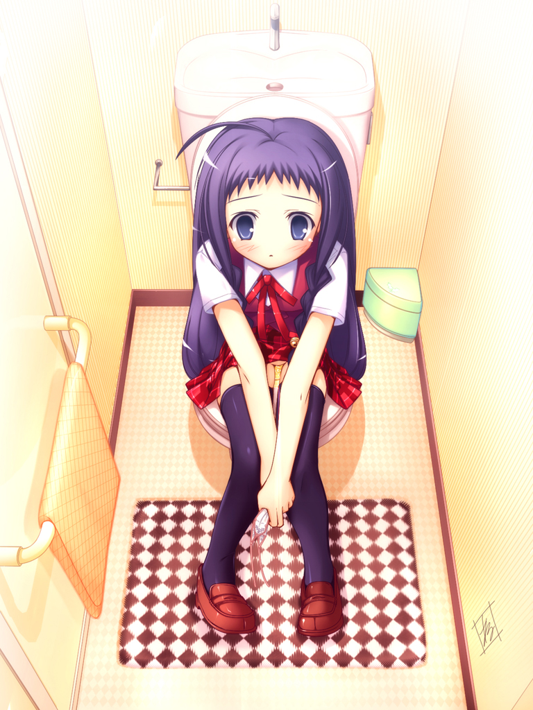 00s1girlblack thighhighsfemale focuslong hairpeepeeingpurple eyespurple hairschool uniformsolothighhighstoilettoilet usetrash can