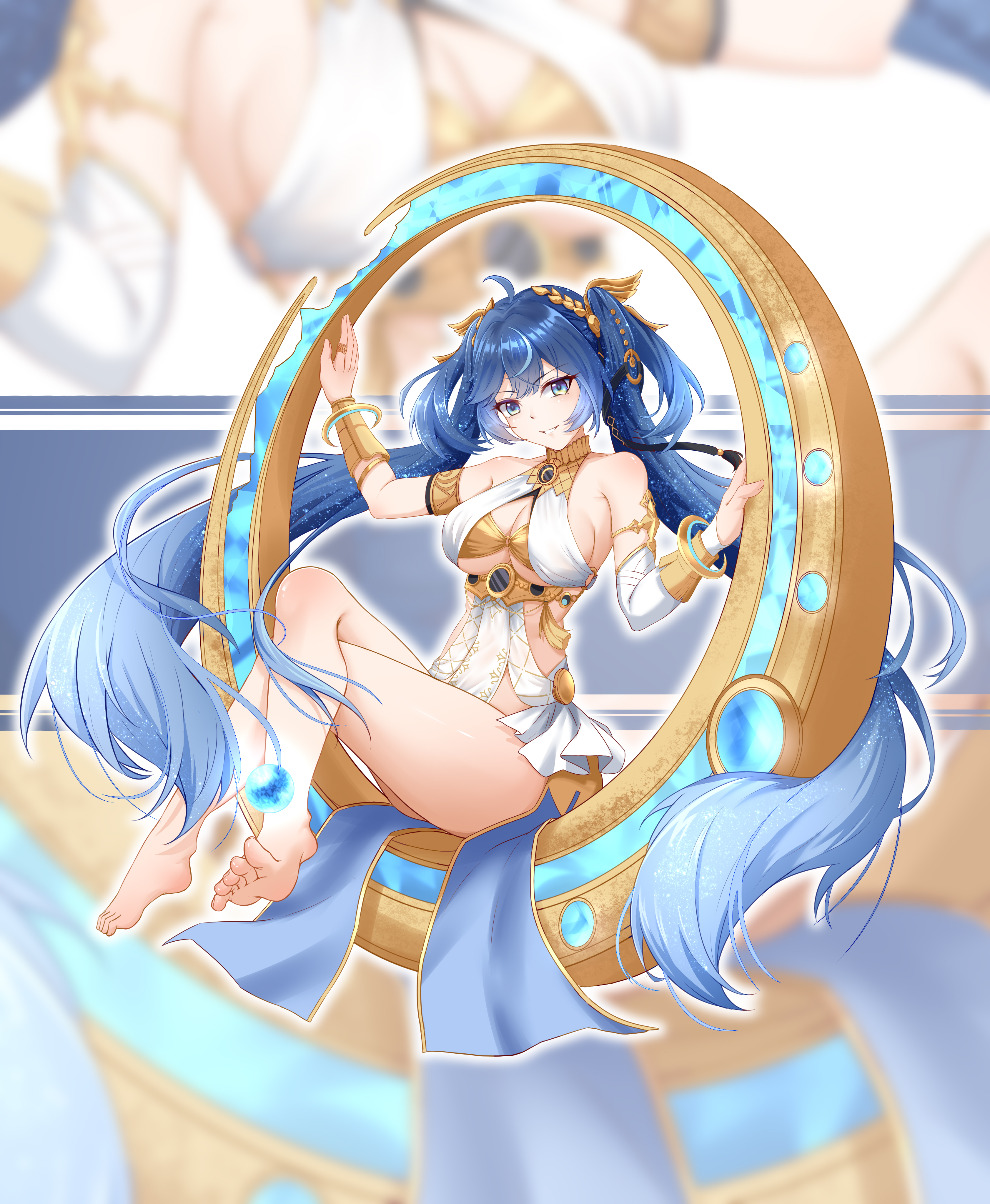 1girlahogearmletbare legsbare shouldersbarefootblue eyesblue hairbreastscrossed legsfeetgold bragradient hairhair beltjewelrylarge breastslaurel crownlegslong hairlooking at viewermulticolored hairorbparted lipssmilesolostreaked hairthighstoestwintailsvambracesvery long hairzoom layer